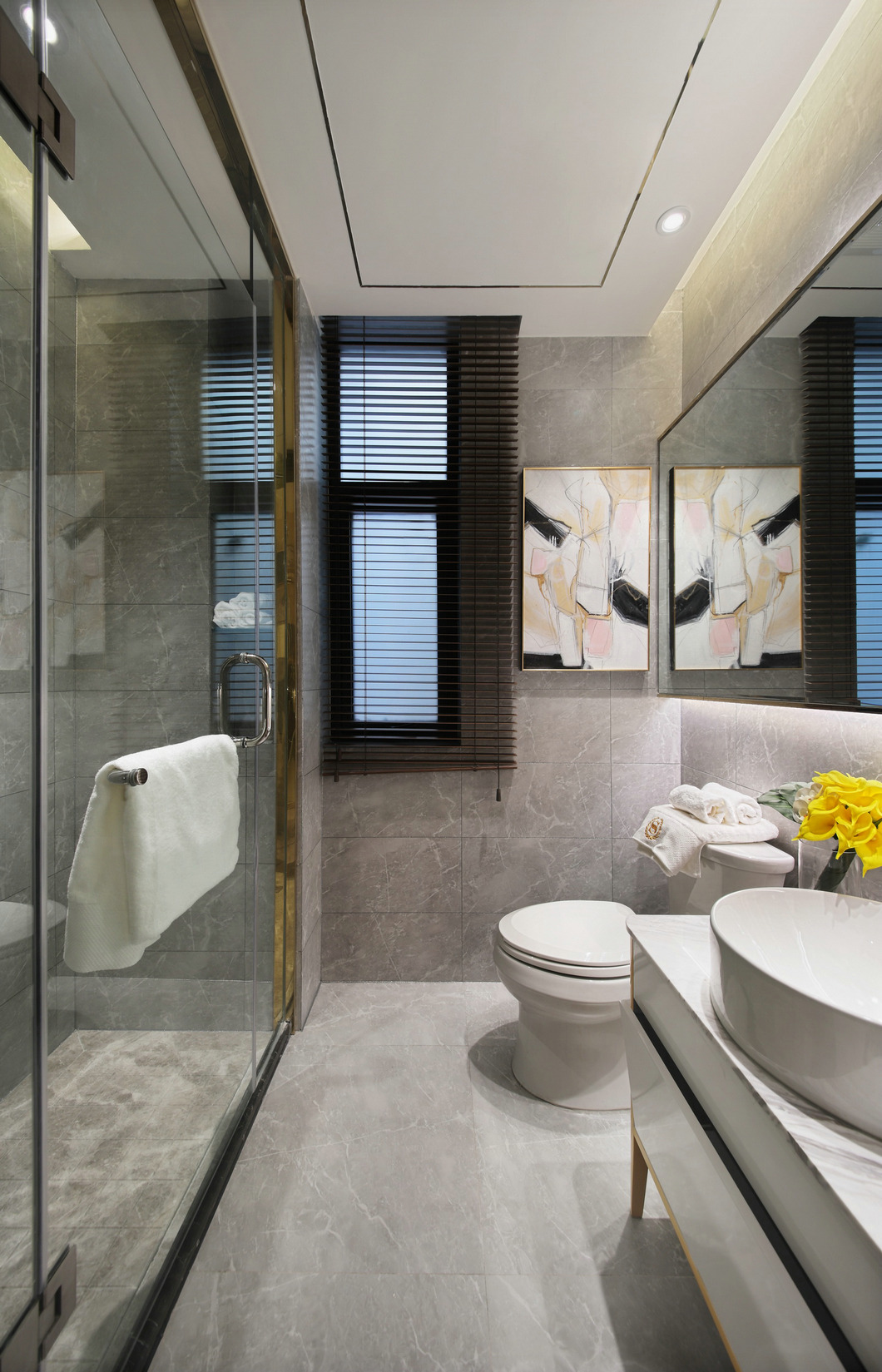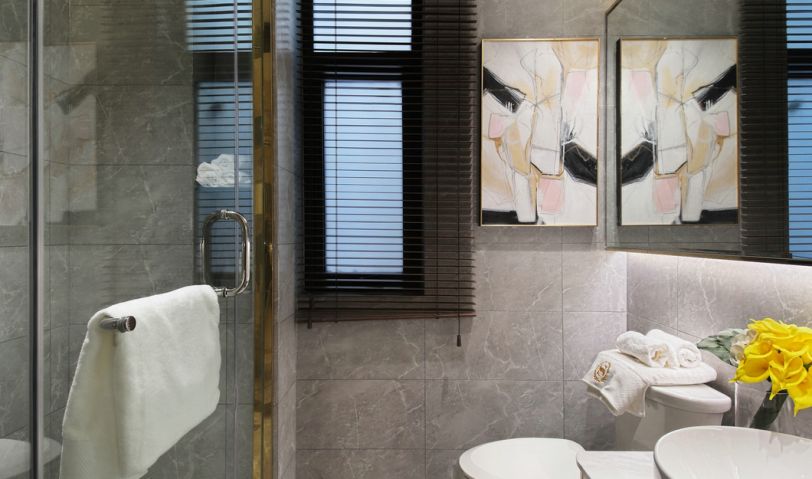 衛(wèi)生間以灰白色石紋瓷磚為主體,令衛(wèi)生間顯得更加干凈整潔,內(nèi)部空間紋理和諧而淡雅。細(xì)膩的白瓷衛(wèi)具搭配藝術(shù)壁畫(huà)為衛(wèi)生間帶來(lái)清新的氣息,寬闊的壁鏡拉伸了空間廣度,拓展了視覺(jué)空間,內(nèi)嵌的led燈帶來(lái)充足的光源補(bǔ)充,讓整個(gè)空間顯得更加明亮。