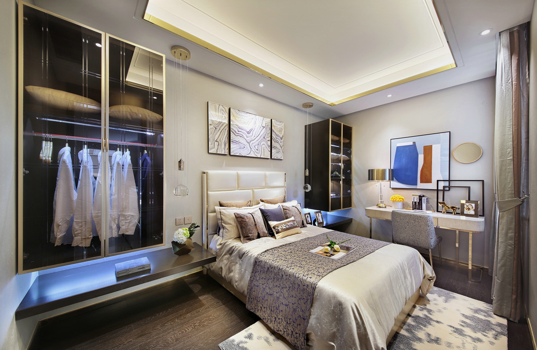 客臥以暖色調(diào)為主體,溫馨自然,有助于留宿的客人安然如夢(mèng)。地上鋪設(shè)著柔軟的地毯,既美觀又起到消音的作用,夜晚在房?jī)?nèi)走動(dòng)也不會(huì)打擾到別人。天花板的光源柔和而不刺眼,除了能提供充足的光亮,LED的燈光壽命更加持久且省電。床上大大小小的靠枕可以輕易消除客人的疲勞,墻上后現(xiàn)代主義風(fēng)格的畫(huà)作讓客臥環(huán)境透露著淡淡藝術(shù)的味道。兩邊壁掛式的衣柜,節(jié)省了室內(nèi)空間,玻璃柜門(mén)設(shè)計(jì)讓空間更加通透,提升了客臥的整體亮度,淡藍(lán)色的燈光打在衣柜上,夢(mèng)幻且朦朧。