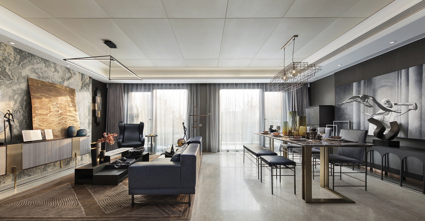 客廳與餐廳相連,自然光由通透的玻璃窗鋪灑進(jìn)來,為居室附上一層溫馨恬靜的光暈。后現(xiàn)代的藝術(shù)裝置與背景的裝飾畫互相呼應(yīng),幾何形制的家具,低調(diào)中彰顯著現(xiàn)代精英氣質(zhì)。