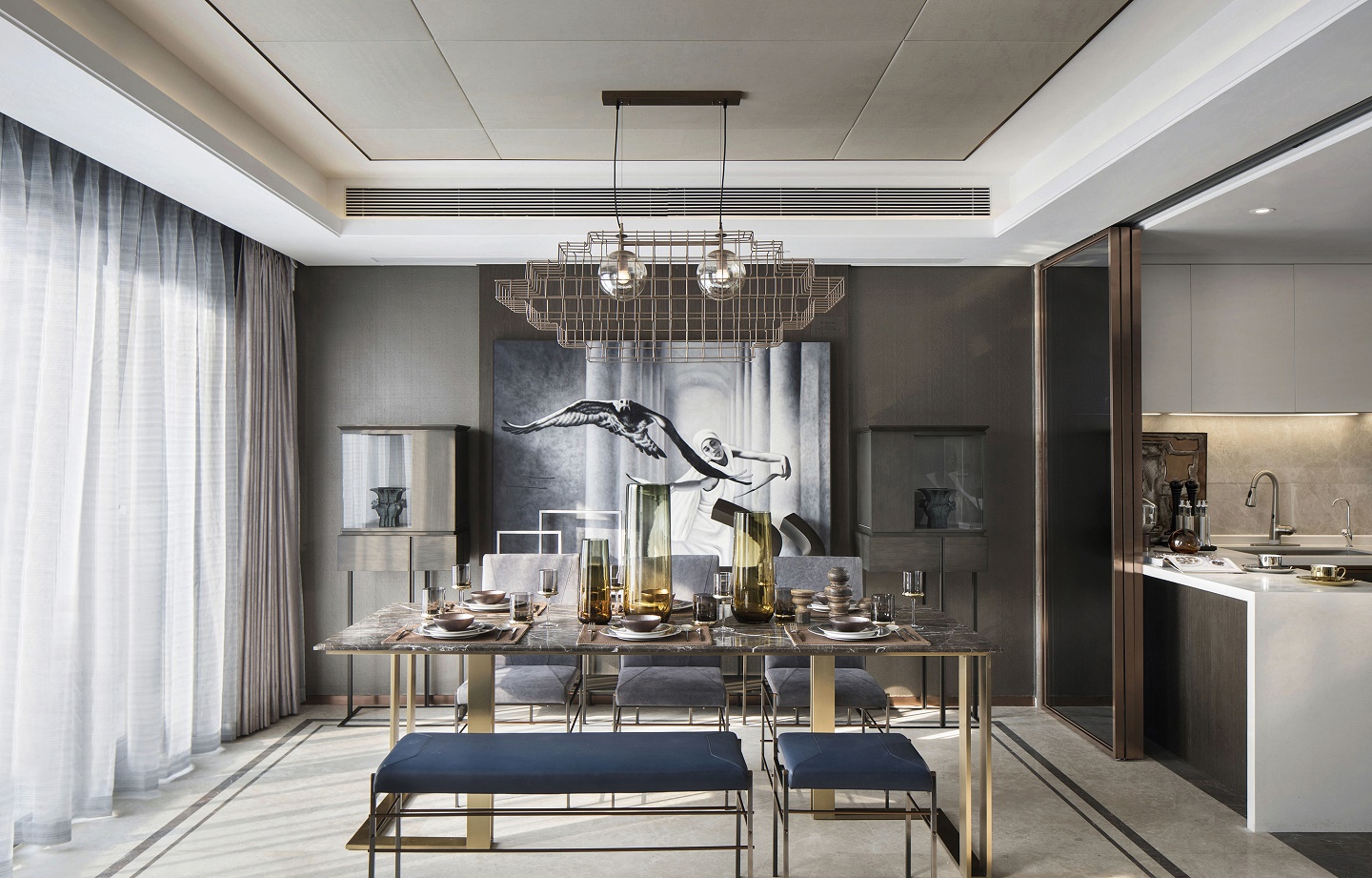 低飽和度的淺橙色與藍(lán)色之間有幽微的碰撞,別致的金屬異型吊燈,與家具的線條結(jié)構(gòu)相互呼應(yīng),營造出與眾不同的空間魅力,其中有溫暖的冷靜、個性的簡約。