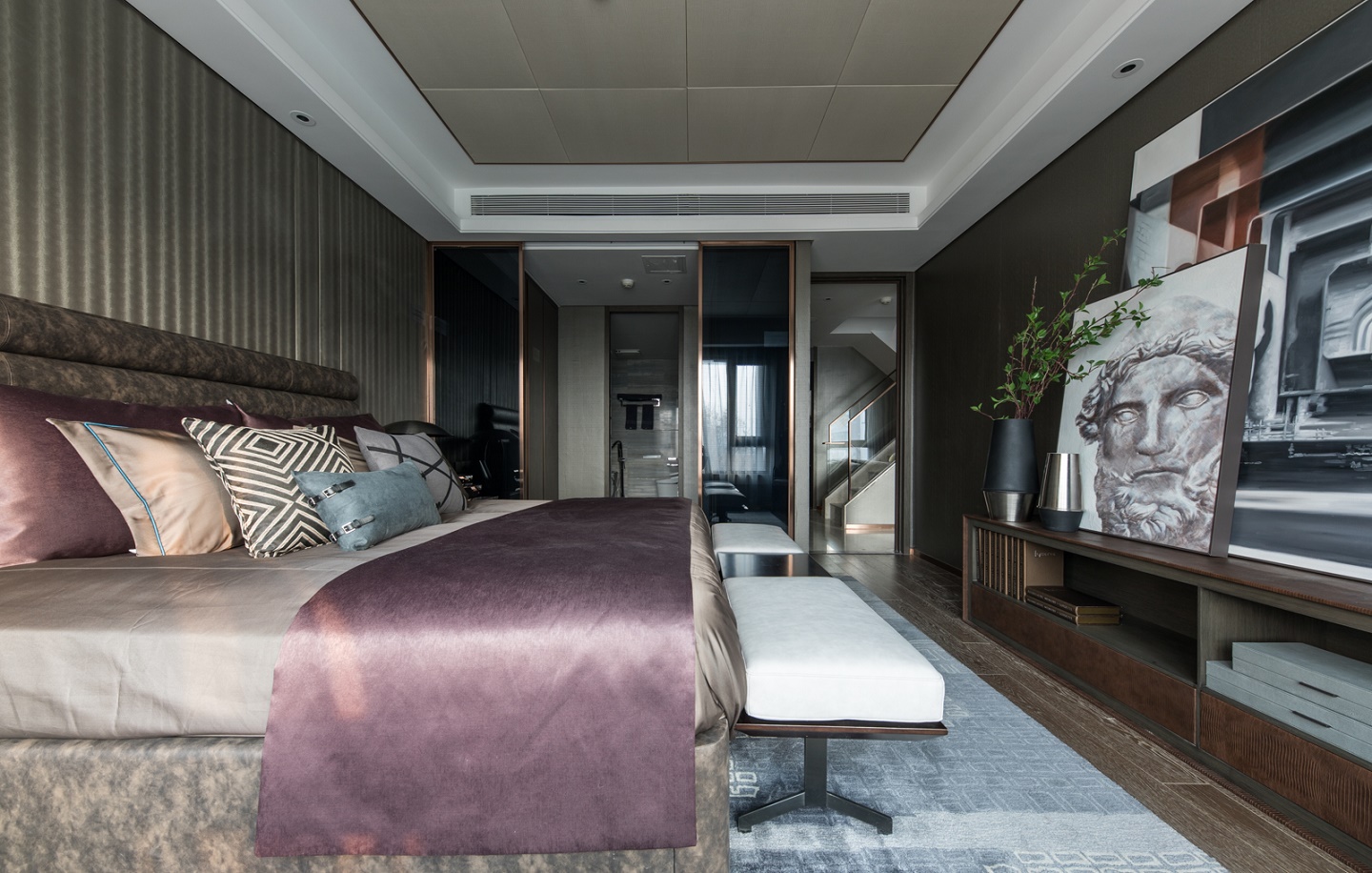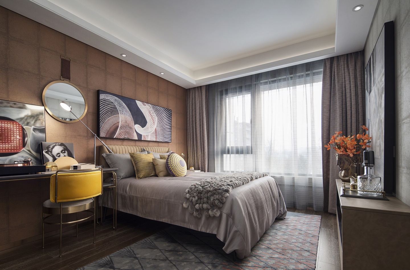 主臥設(shè)計體現(xiàn)了優(yōu)雅的藝術(shù)品位,整體空間層次豐富且有序,具象和抽象的交織扭結(jié),碰撞出嶄新的空間想象,在嚴(yán)謹(jǐn)理性中涂抹上輕松瀟逸的一筆。