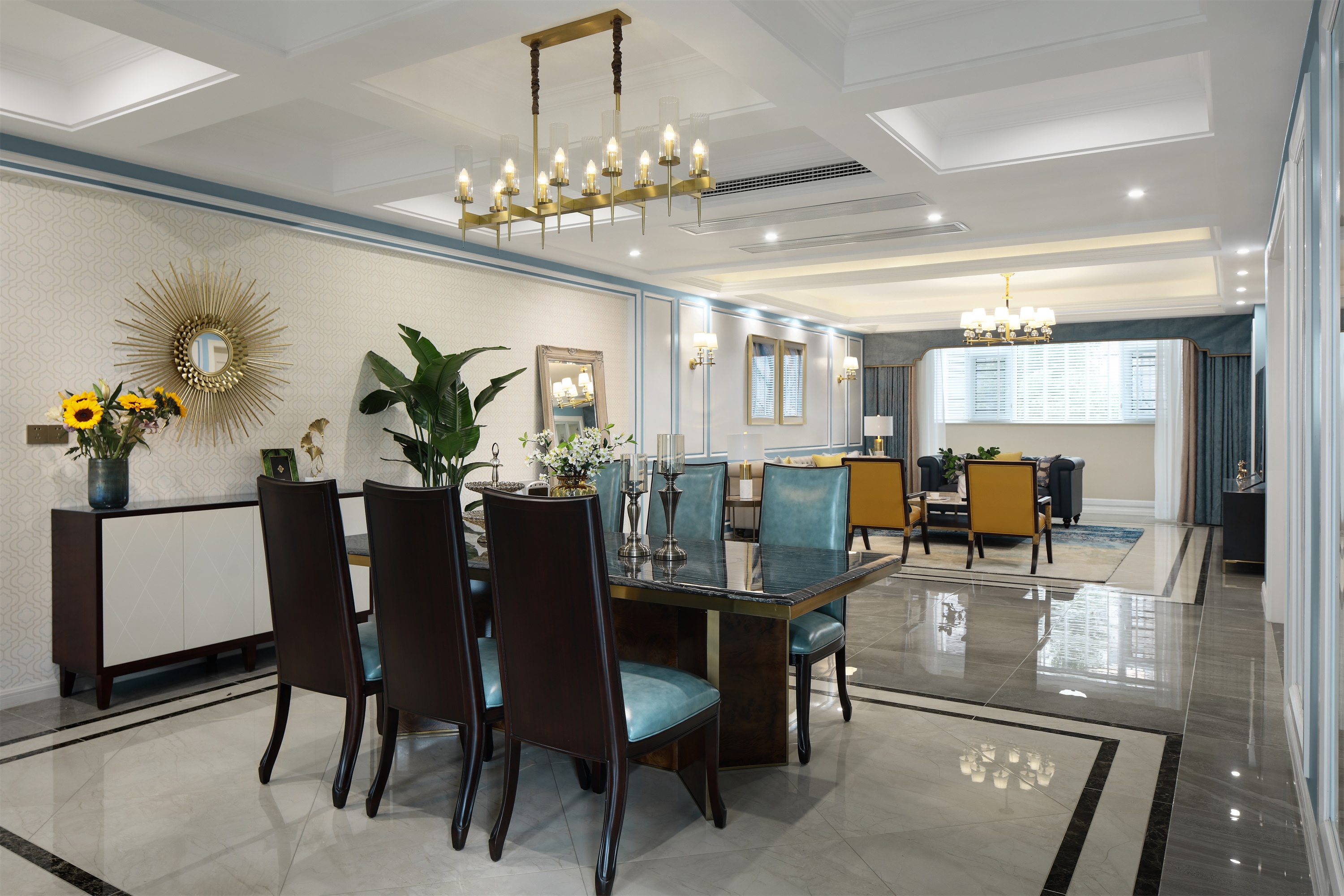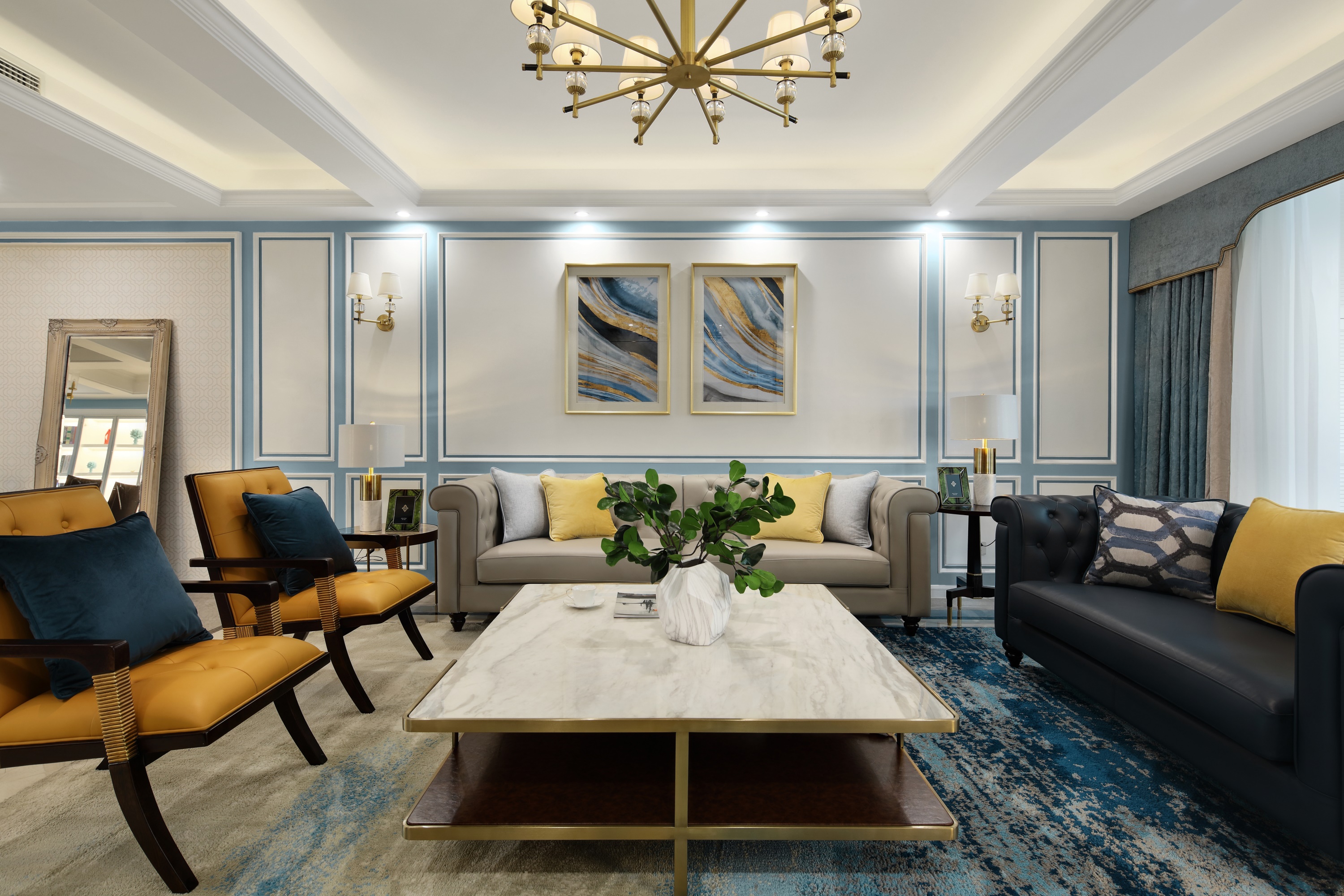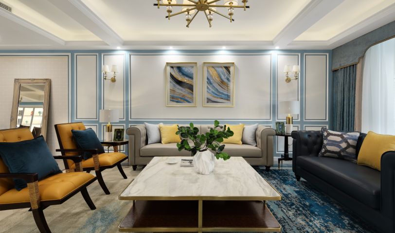 客廳以米白色的背景與藍(lán)色的護(hù)墻線條打底,留白的設(shè)計(jì)手法表現(xiàn)空間的視覺效果。壁燈與洗墻燈的完美配合,保證整體照明節(jié)奏。在家具的選擇上,用磨砂面的皮質(zhì)沙發(fā)與大理石茶幾將輕奢質(zhì)感歸于生活。