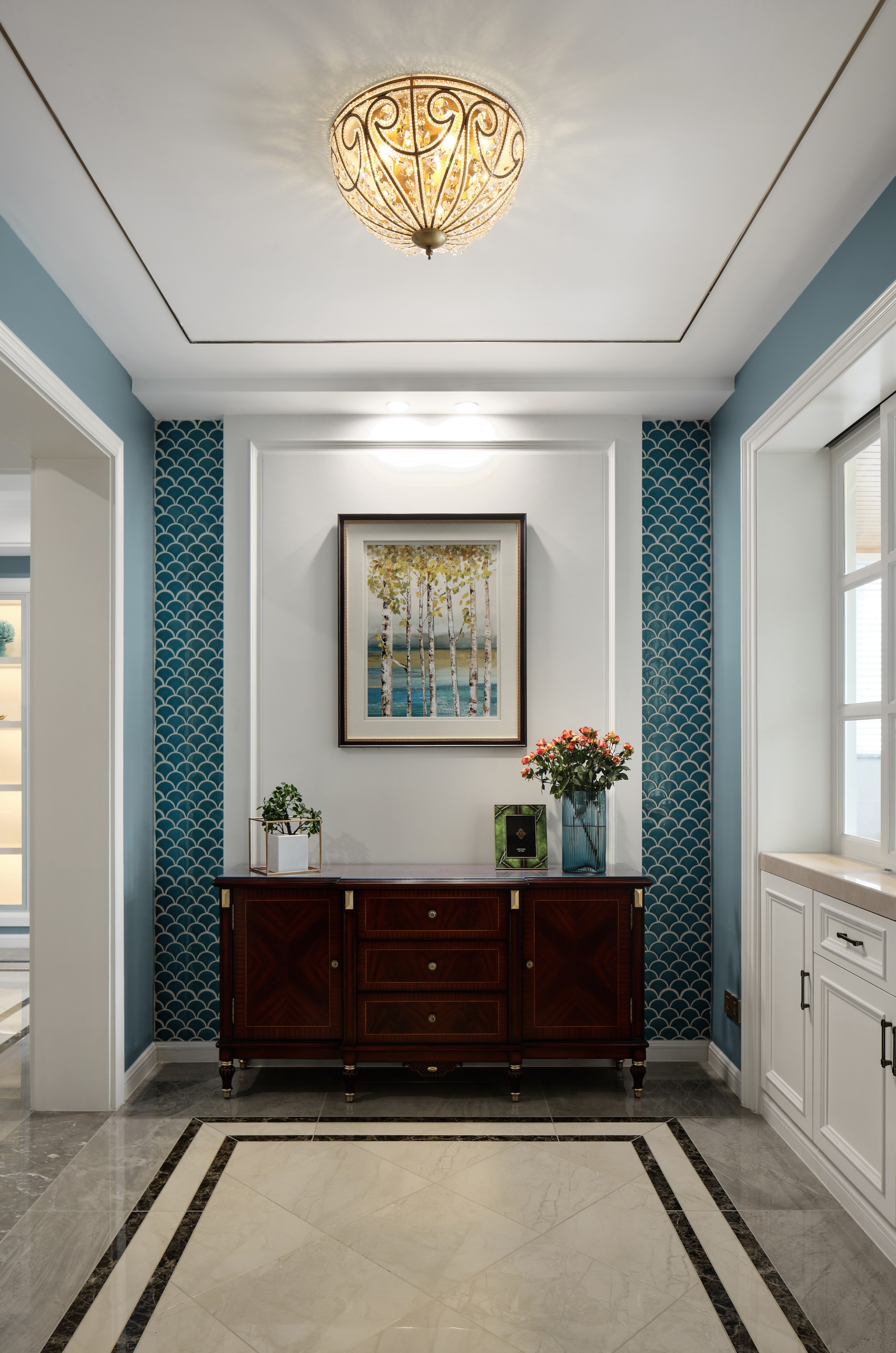 大膽的運(yùn)用魚鱗片狀的瓷磚,刻畫設(shè)計(jì)細(xì)節(jié),以藝術(shù)的造詣重新定位結(jié)構(gòu)。不矯揉造作,保持原汁原味的空間觸感。弱化玄關(guān)柜的視覺,讓進(jìn)門的感受更加屈從于對藝術(shù)的打量,使設(shè)計(jì)無聲無息的融合到生活中,在漫不經(jīng)心中尋求理性。