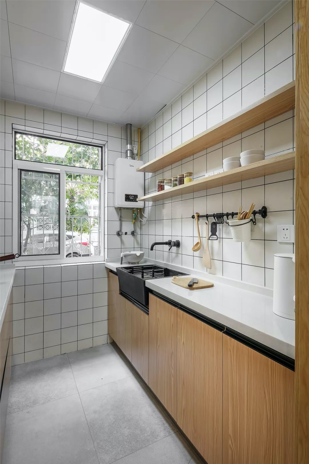 廚房是長(zhǎng)條型空間,兩側(cè)靠墻分別設(shè)計(jì)了櫥柜+吊柜組合,將油煙機(jī)藏進(jìn)吊柜中,小空間中線條保持一致,干凈利落、井然有序
