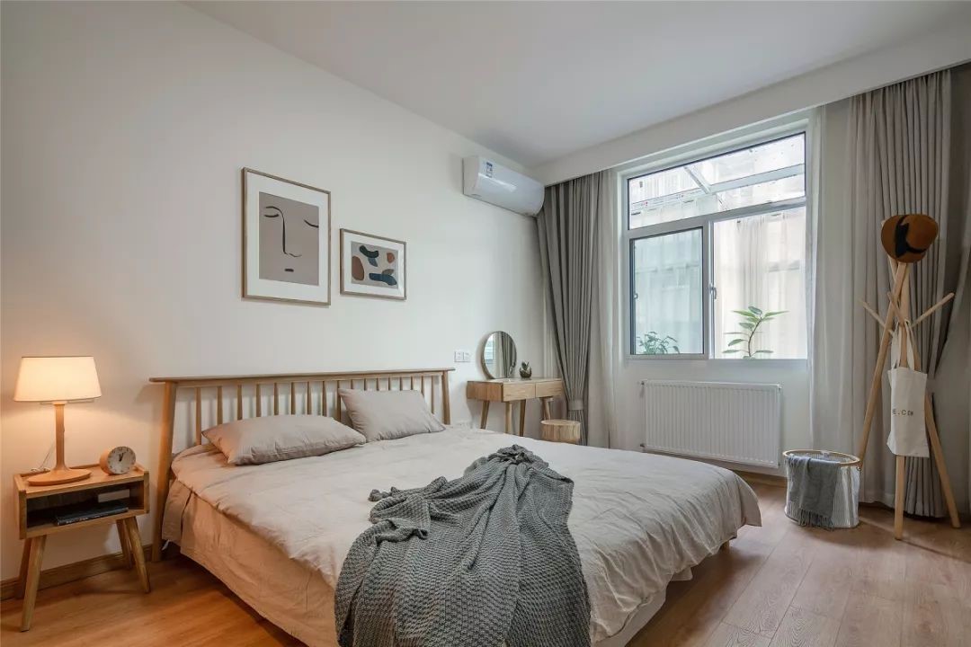 臥室延續(xù)整體空間的色調(diào),原木的自然觸感+交錯(cuò)有致的白蠟?zāi)炯y理,打造溫馨睡眠環(huán)境。