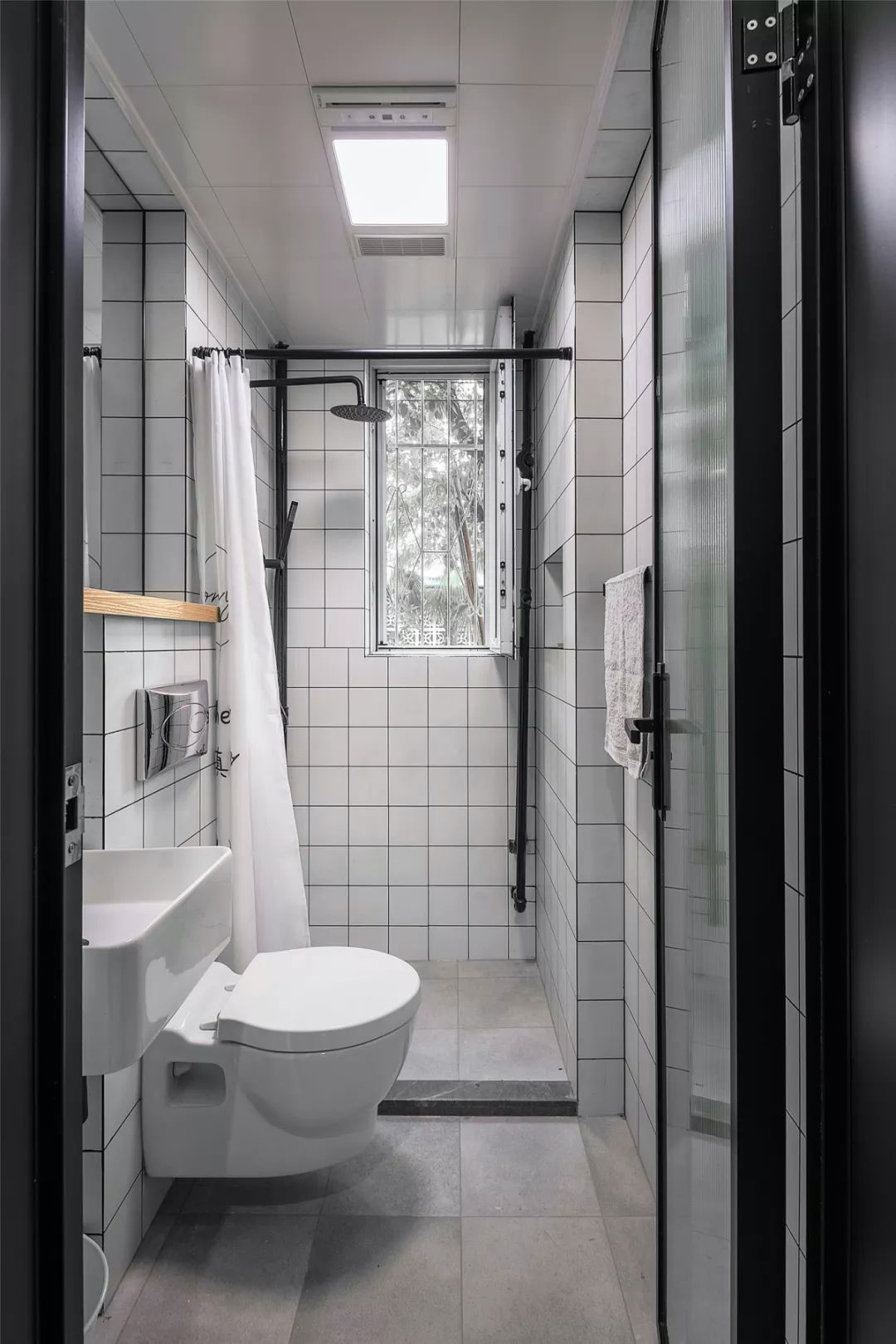 衛(wèi)生間壁掛馬桶設(shè)計(jì)解決難清理的問(wèn)題,淋浴區(qū)設(shè)計(jì)在靠窗位置,利用浴簾做干濕分離,壁龕的設(shè)計(jì)用來(lái)放洗浴用品.