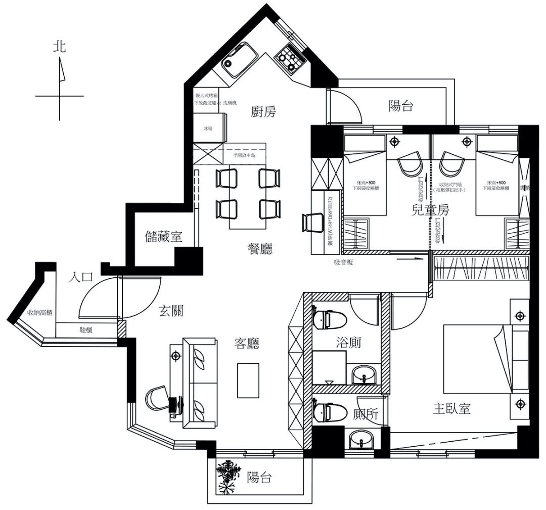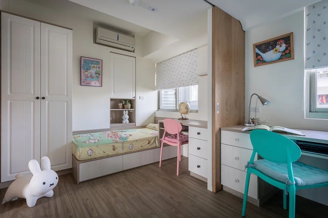 兒童房::使用對稱手法使雙間女兒房等比開展,同時(shí)植入一道收納式滑門形成分野。