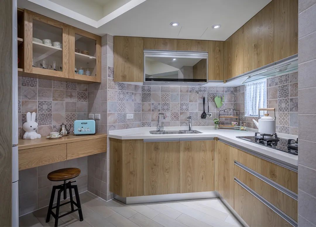 廚房:推開滑門,原先呈現(xiàn)銳利三角狀的畸零格局,經(jīng)設(shè)計(jì)細(xì)膩布局,打造出業(yè)主專心研究料理的小天地。
