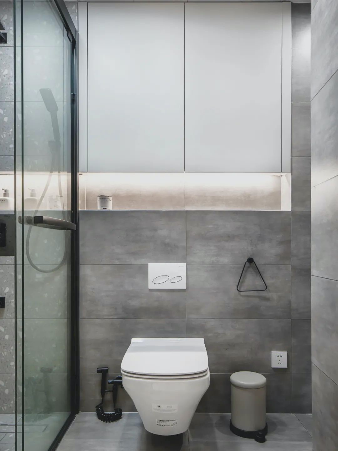 衛(wèi)生間:衛(wèi)生間門采用時(shí)尚黑色的谷倉門,解決了平開門的弊端,內(nèi)部做了壁掛馬桶,馬桶頂部還做了收納柜,淋浴區(qū)用玻璃隔斷做了干濕分離,讓衛(wèi)生間擺脫超市的煩惱。