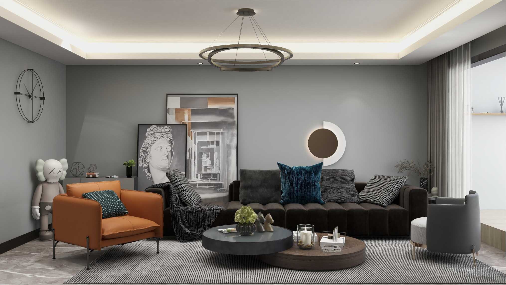 客廳整體以深色為主,單椅選擇了一個(gè)橙色單椅,整體提升空間感