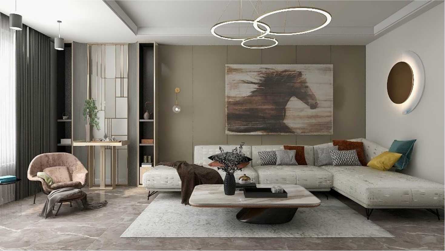 客廳背景墻選用了暖色調,搭配淺色沙發(fā)
