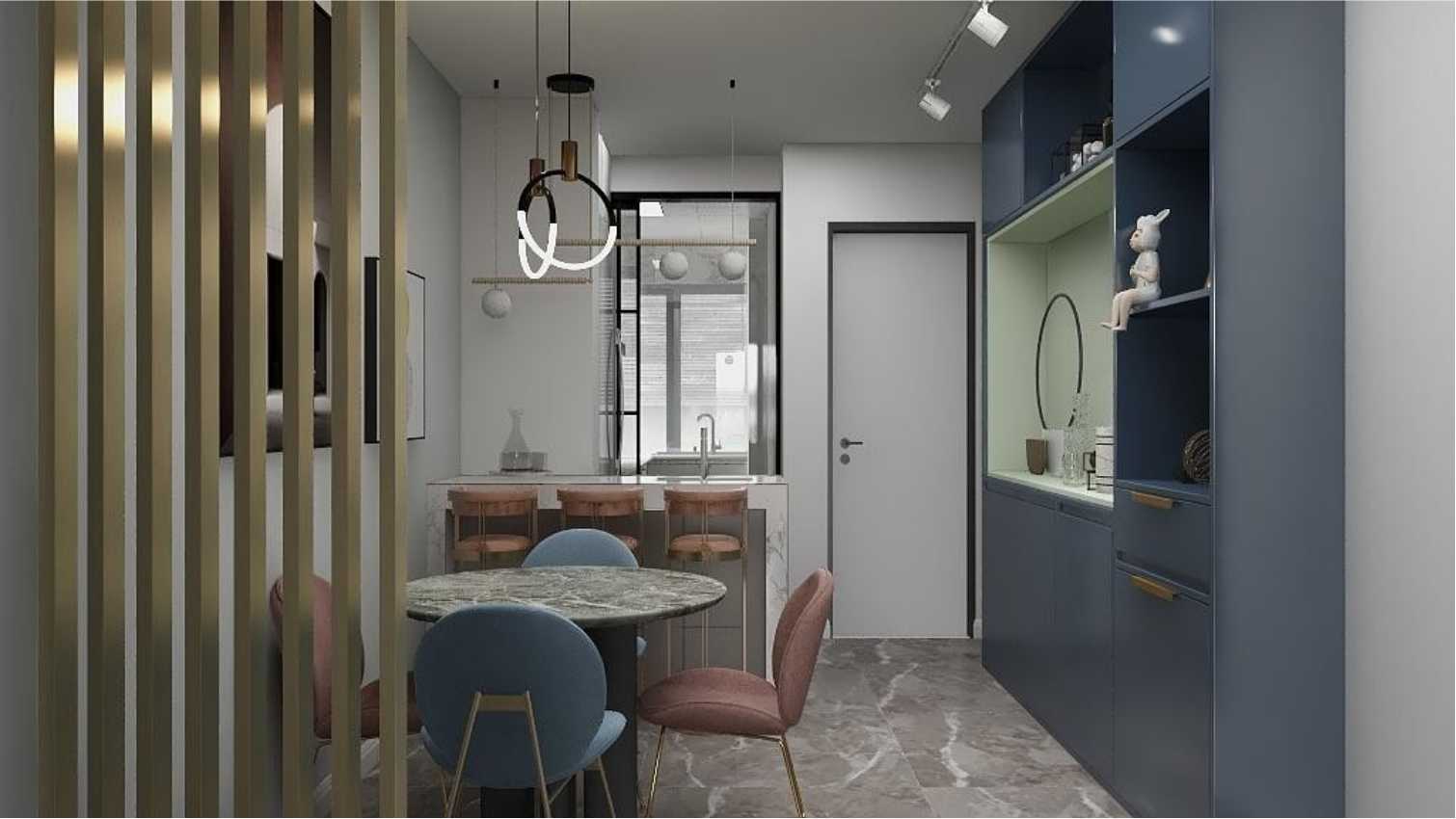 開放式廚房搭配吧臺 配著藍色的餐邊柜整體空間活躍很多。
