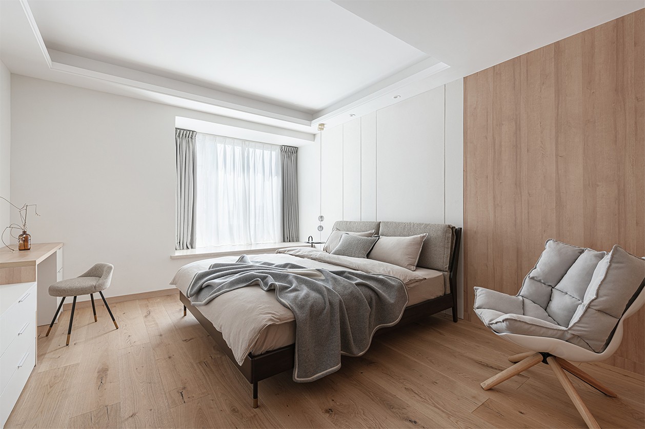 臥室地板和部分墻面采用天然樸實(shí)的木質(zhì)材料,營(yíng)造出柔和靜謐的休憩氛圍,與公共空間的原木風(fēng)格相呼應(yīng)。