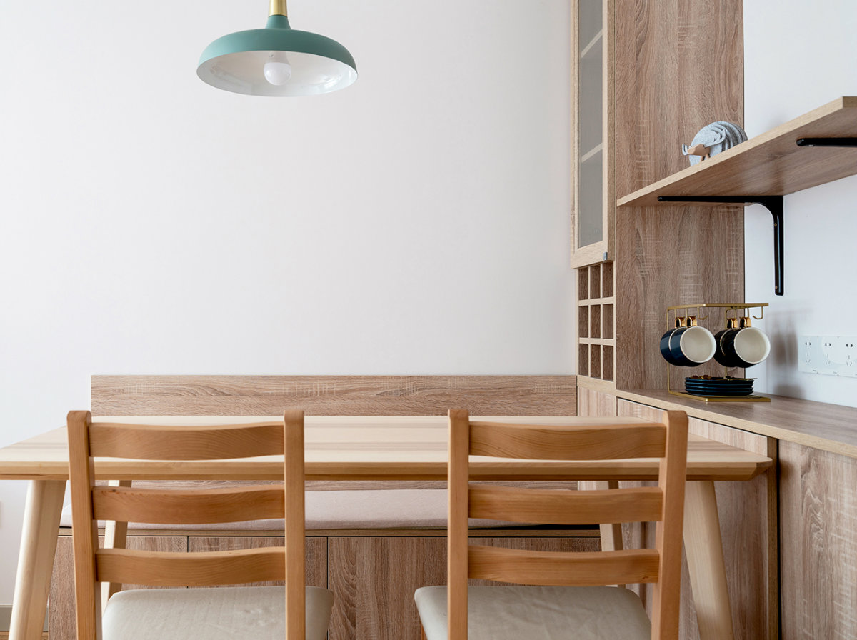 卡座一直是小戶型的不二之選,空間利用絕對(duì)高,還能增加儲(chǔ)物和收納。餐桌邊上設(shè)計(jì)了餐邊柜,平時(shí)的一些小電器方便使用,紅酒還有收藏的一些杯子也有空間展示。簡(jiǎn)潔自然,給人的感覺就會(huì)是舒服干凈,沒有絲毫違和感。