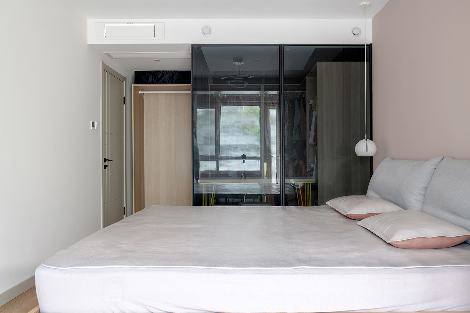 主臥進(jìn)門處看,空間也是比較通透的,絲毫沒有因?yàn)樯钌A?,帶來的壓抑感。背景墻刷了暖灰色漆,再配合原木和灰色亞麻布藝,暖到心里了?br />