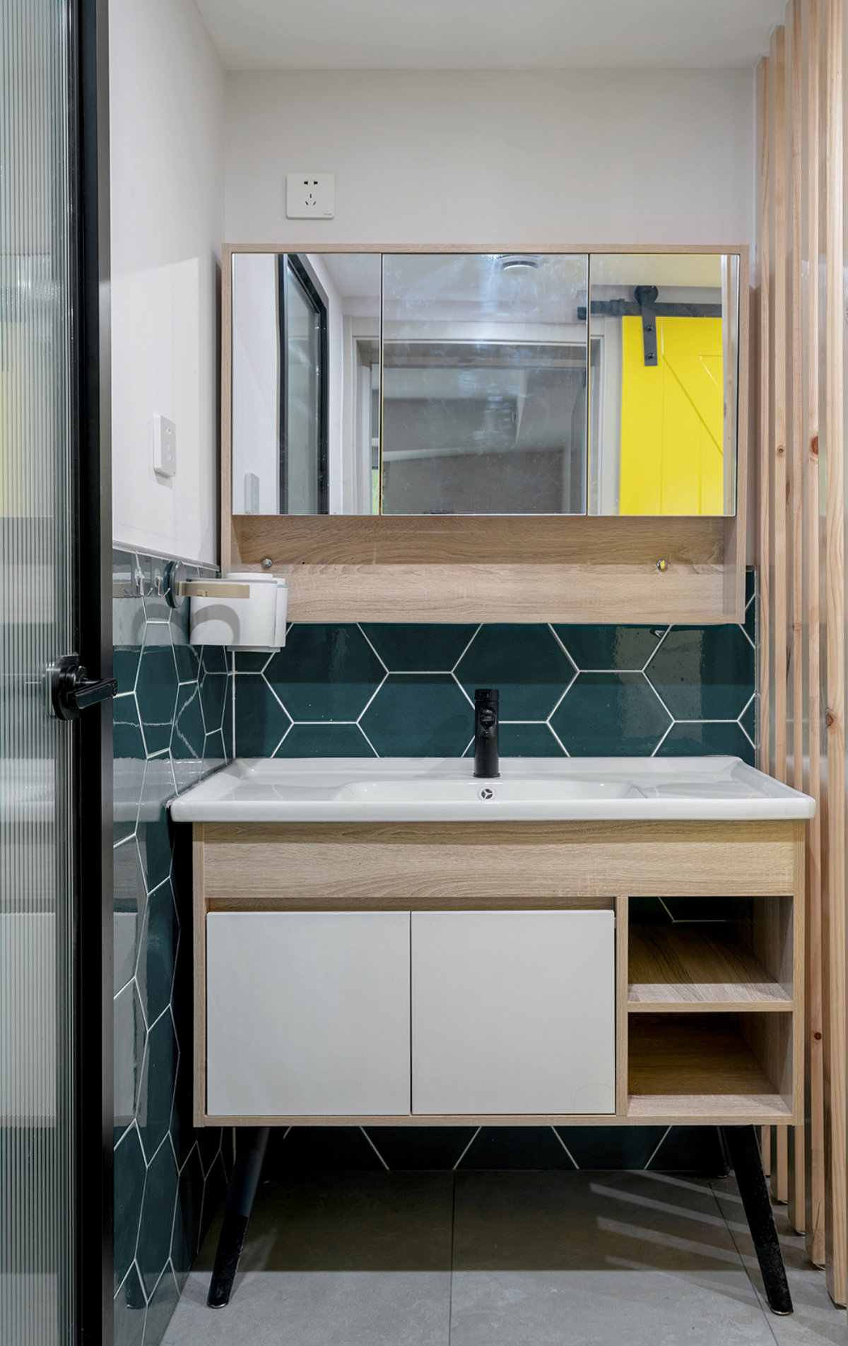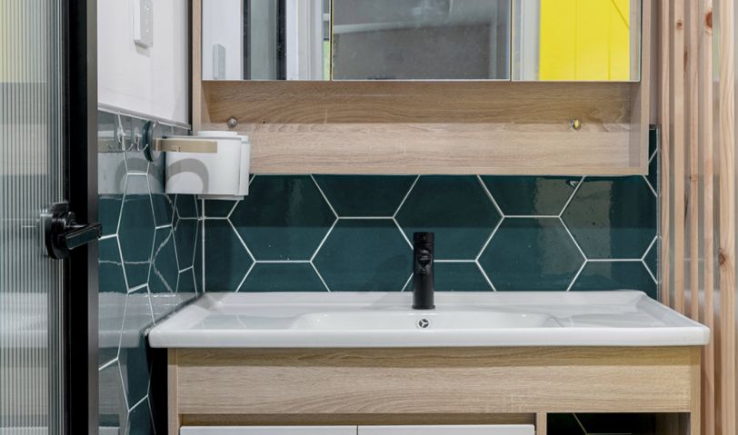 洗漱區(qū)放到了外面,這樣衛(wèi)生間里外的功能,可以同時(shí)使用。側(cè)面安裝了屏風(fēng),這樣就不會(huì)進(jìn)門一眼看到手盆,保持了進(jìn)門玄關(guān)的美觀和完整性。用墨綠六角形瓷磚做點(diǎn)綴,高度上則是只貼到了半墻。其實(shí)像這樣的空間瓷磚不用貼通太高,可以只貼鏡柜后面,或者3面。上部可以刷防水漆進(jìn)行拼接裝飾,裝飾彈性和選擇性都很大,完全可以根據(jù)自己的喜好來設(shè)計(jì)這個(gè)角落。衛(wèi)生間加入了不小的按摩浴缸,特意在千挑萬選中找了這款扇形的,這樣可以保證里面空間的動(dòng)線流暢。地面鋪設(shè)地磚的時(shí)候,特意做了凹凸紋理和防滑處理。防腐木安裝在淋浴房區(qū)域,與外面的地磚正好平齊,光腳踩在里面也不會(huì)涼。