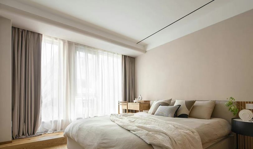 主臥延續(xù)了原木與白的搭配,淺色系的軟裝,營造出既溫馨又質(zhì)樸的私人空間。