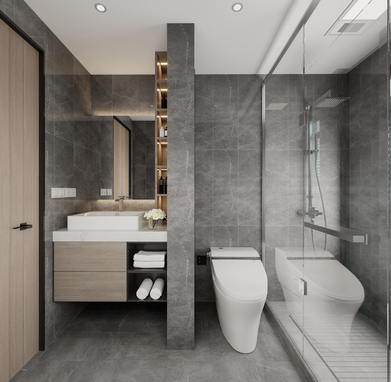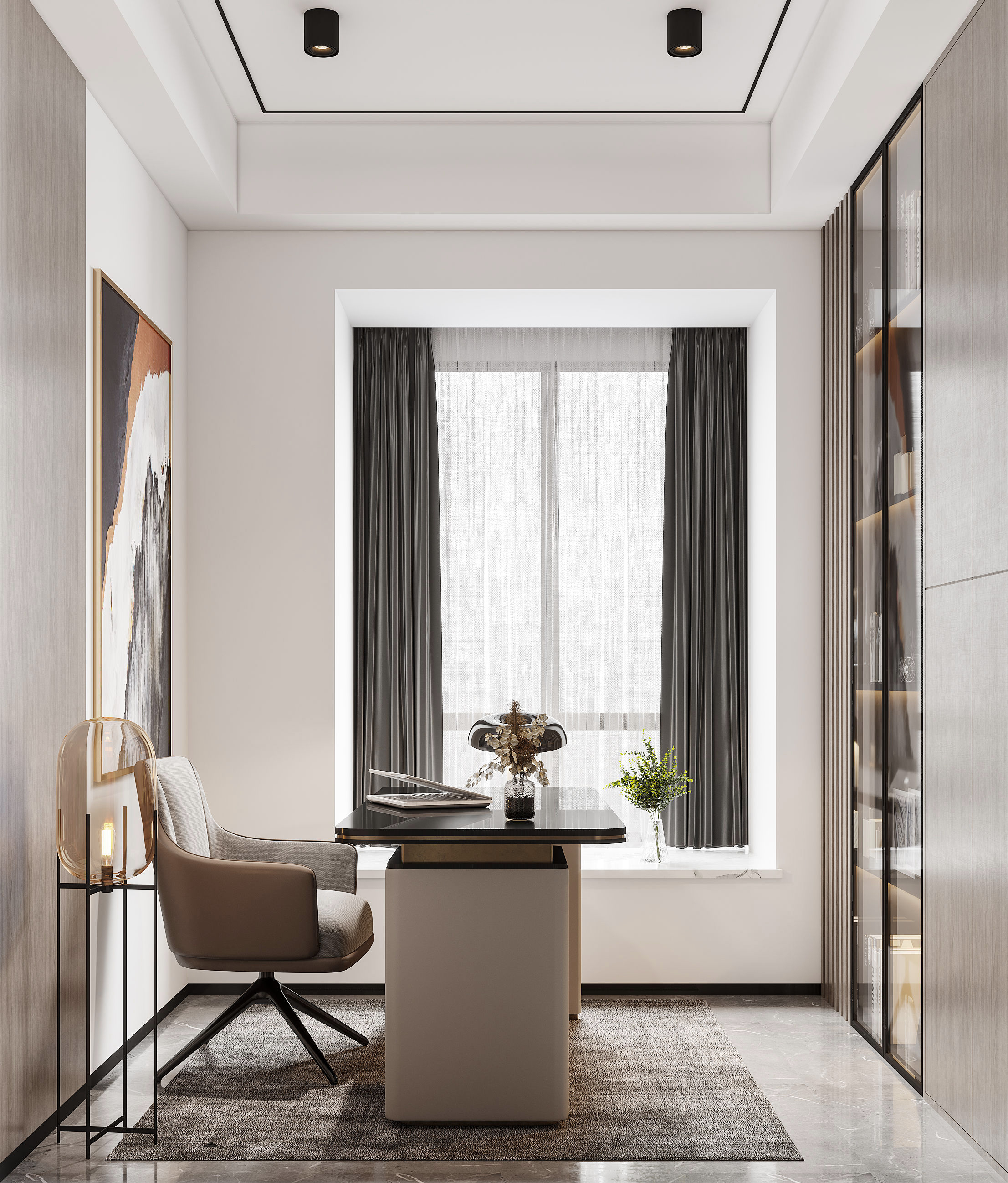 書(shū)房開(kāi)敞通透的格局與過(guò)道連接,“方寸之間成天地,一籍文字知乾坤”,長(zhǎng)虹玻璃隔斷劃分出兩個(gè)空間不同的功能需求,不失整體。
