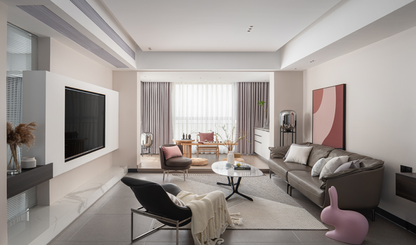 通透、明亮,格局上的宏大與獨立女性的高瞻遠矚相呼應??蛷d簡潔的無主燈頂面加上淺灰啞光地磚,整個空間雅致淡定從容。客廳的光影隨著一天中時間有著深淺且細膩的變化,有時候爬滿了慵懶,有時候是跳躍的韻律,豐富著空間的情調(diào)內(nèi)涵。