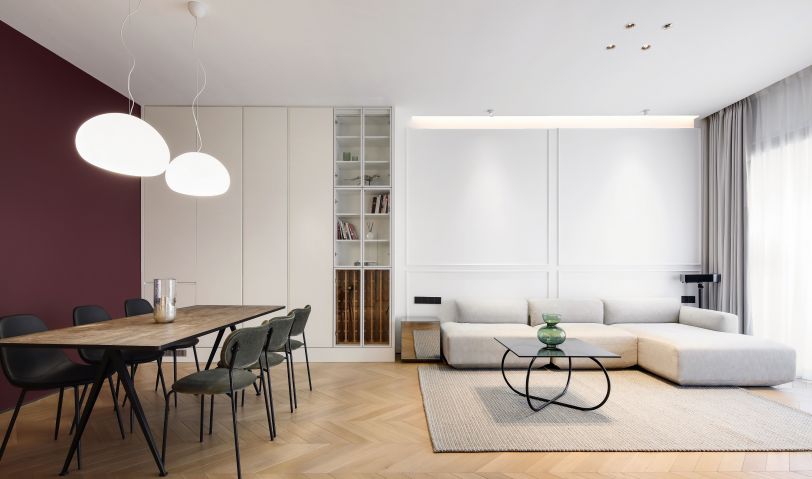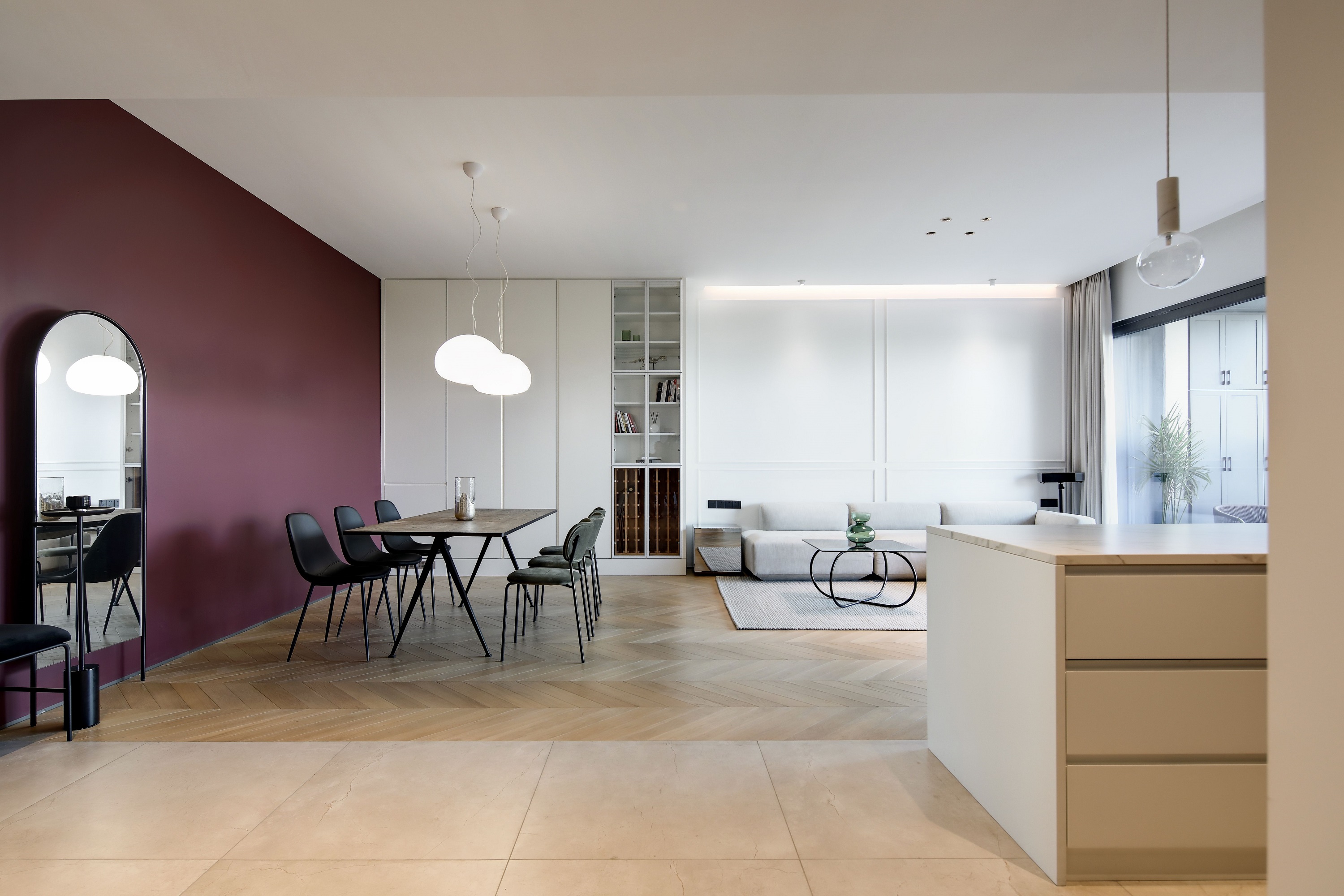 打通墻體后,廚房和客餐廳多了連接,更顯通透。大件家電則選擇“隱身”,空間姿態(tài)更輕薄簡約、收納力足夠,同時(shí)延續(xù)著瑪薩拉酒紅和風(fēng)暴綠的撞色氣質(zhì)。