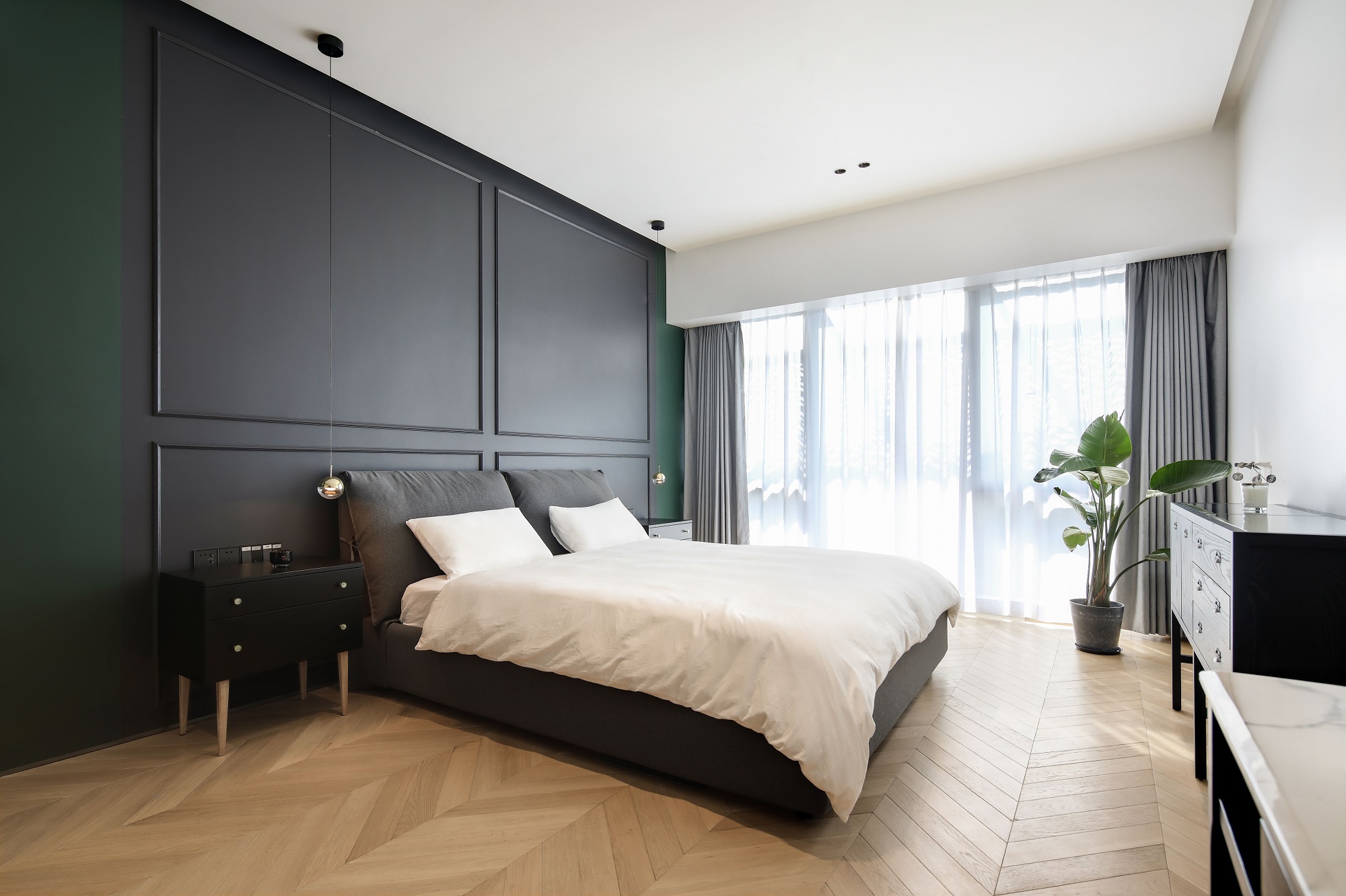 悄然推開門,寧靜的色彩掠去心中浮躁,暖色的魚骨拼木地板調(diào)和出空間的平衡,飄逸的白紗,清風(fēng)拂過,就好像輕柔地吹在心上。拉上遮光窗簾,隔絕喧囂、攏住浪漫~