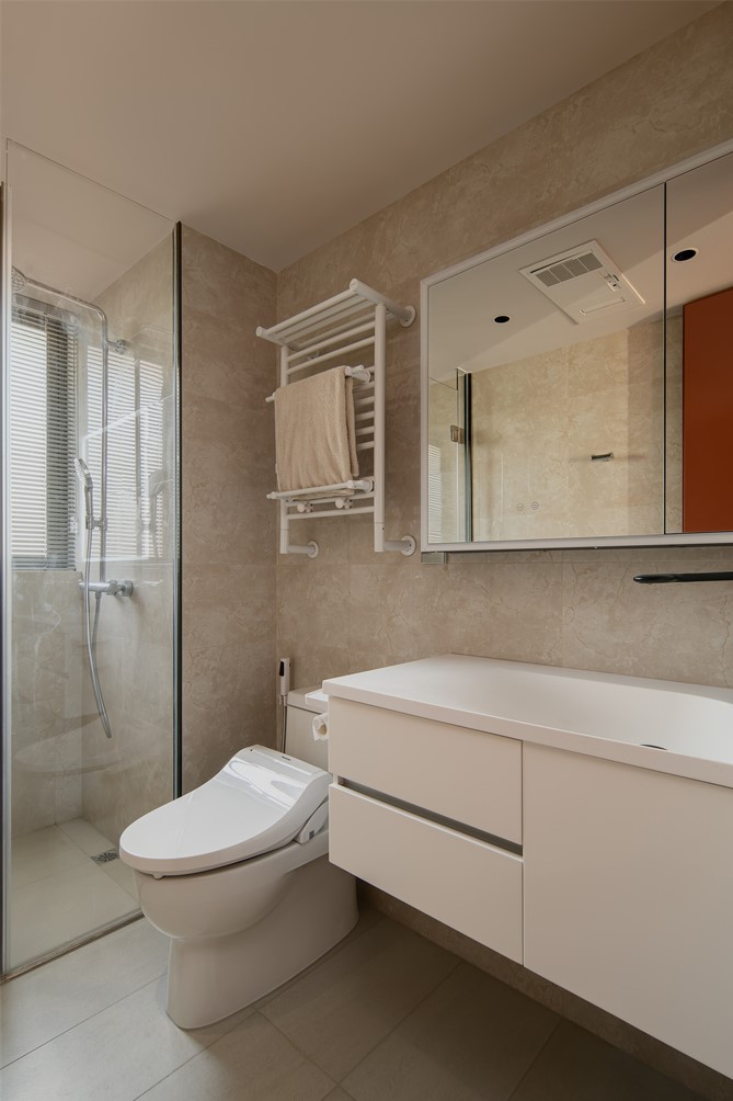 衛(wèi)生間在保留原精裝修基礎(chǔ)上,加裝風(fēng)暖、電熱毛巾架、智能馬桶蓋,并更換鏡柜(內(nèi)有插座開(kāi)關(guān))、浴室柜和花灑套裝。