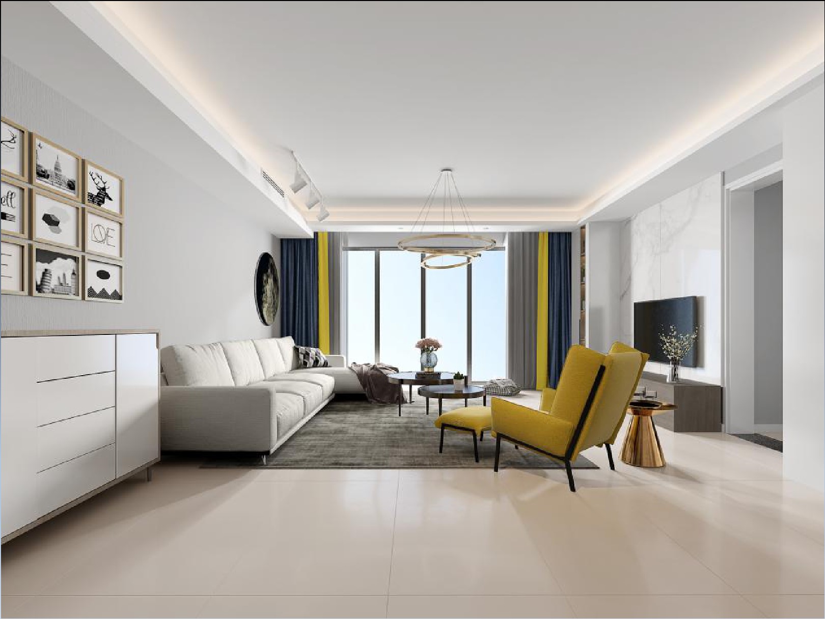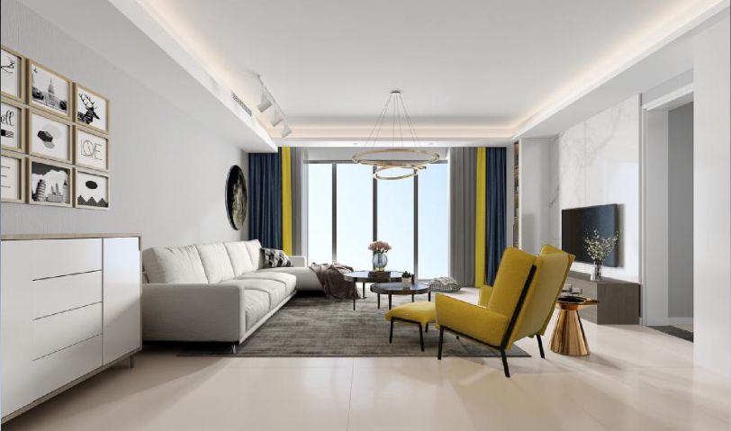 在客廳色調(diào)的選擇上,以淡雅的暖色調(diào)為主。運用黃色的單人沙發(fā)作為跳色,通過大理石電視背景墻與藝術(shù)品的懸掛和燈光的使用,營造空間的時尚感