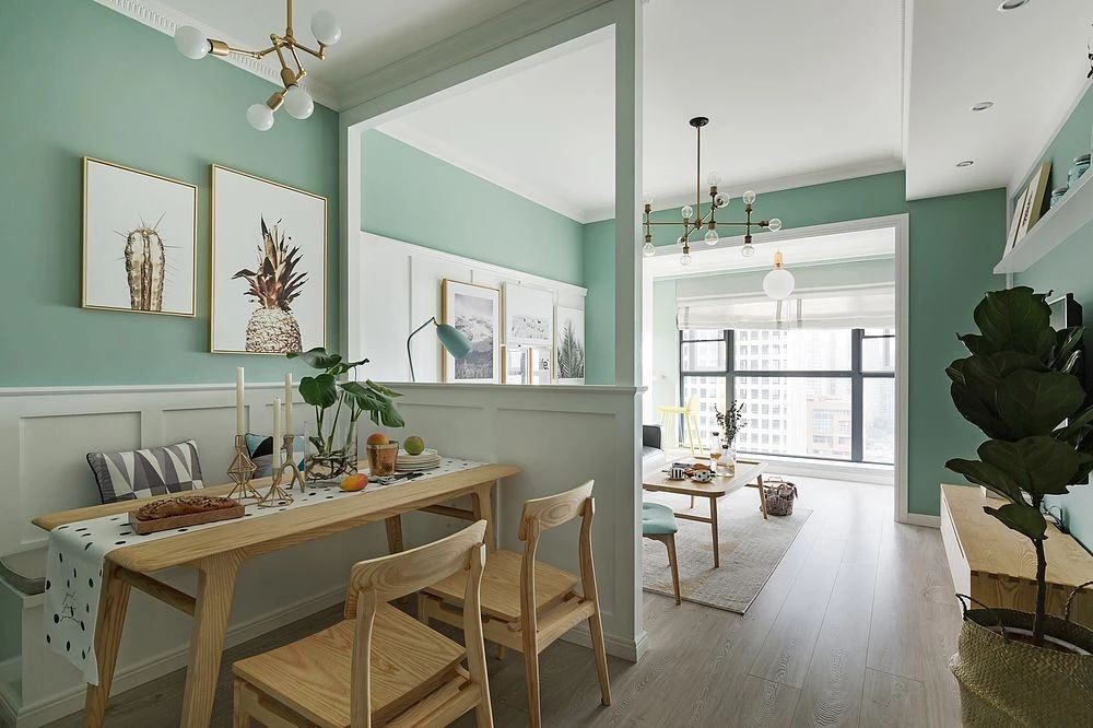 不太寬敞的客餐廳空間通過增加一個(gè)半高隔斷區(qū)分了出來,在不影響采光的情況下又使餐廳擁有了可以收納物品的卡座
