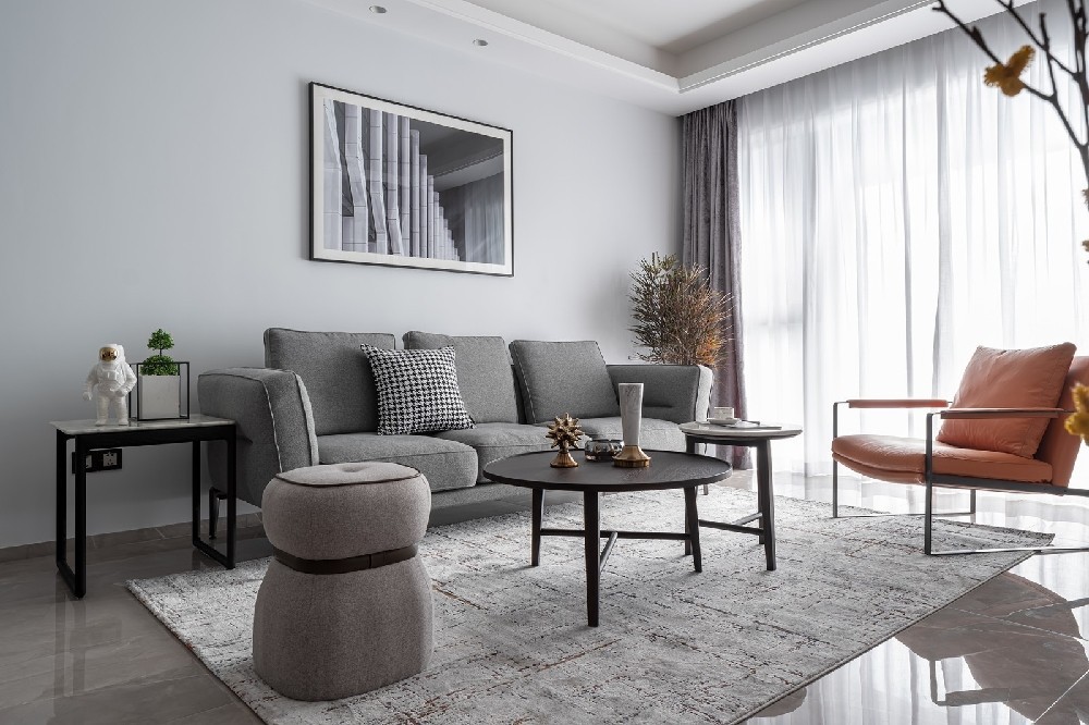 灰色既沉穩(wěn)考究又柔和高雅。從餐廳望向客廳,愛馬仕橙色單人椅在整個灰色空間中越發(fā)出挑。為空間增添了一絲靈動感