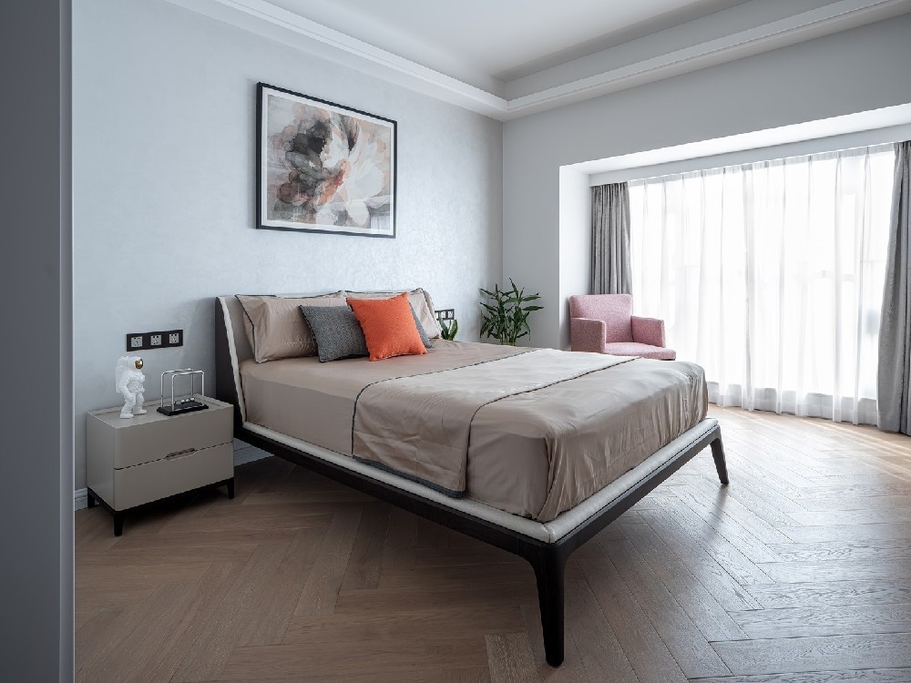 暖系地板做鋪墊,冷色系墻面做撞色,凸顯了層次感,床頭背景藝術(shù)漆做了處理,使空間變得律動了起來。