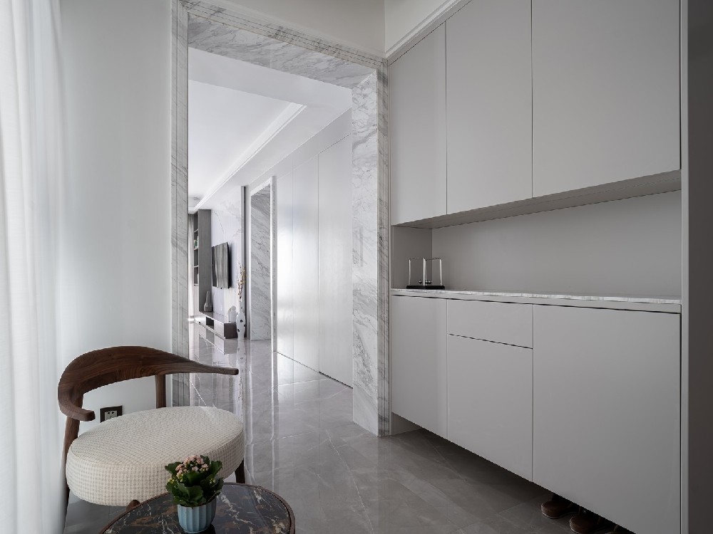入戶玄關(guān)打造了一個休息區(qū),方便屋主在繁忙工作的后,回到家換鞋小憩一下。明處展示破除整體一色德沉悶,增加了層次感。暗處收納將瑣碎與無序收納到鞋柜中,留下整潔的好印象。