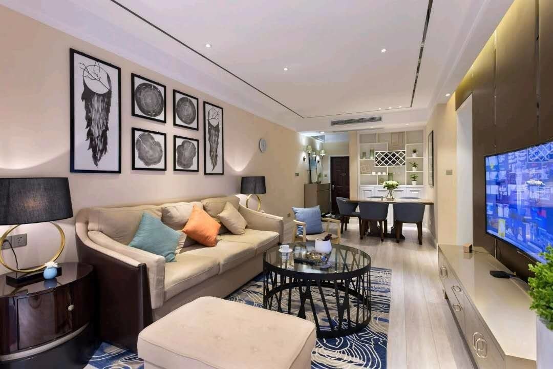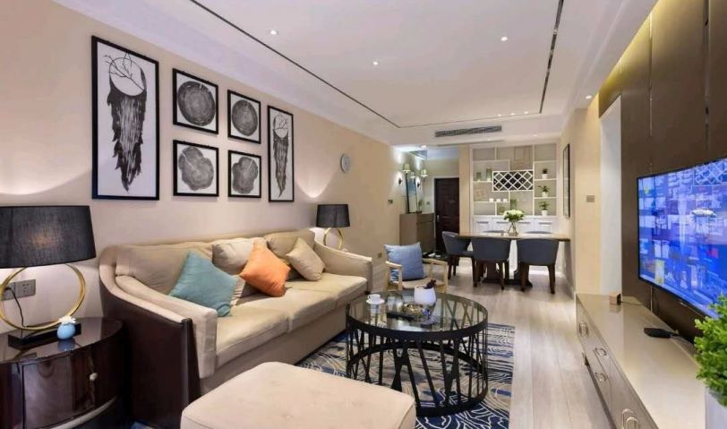 電視背景墻采用深色壁紙飾面,及大方又有氣派,結合軟裝的顏色,讓空間感,視覺感更強。