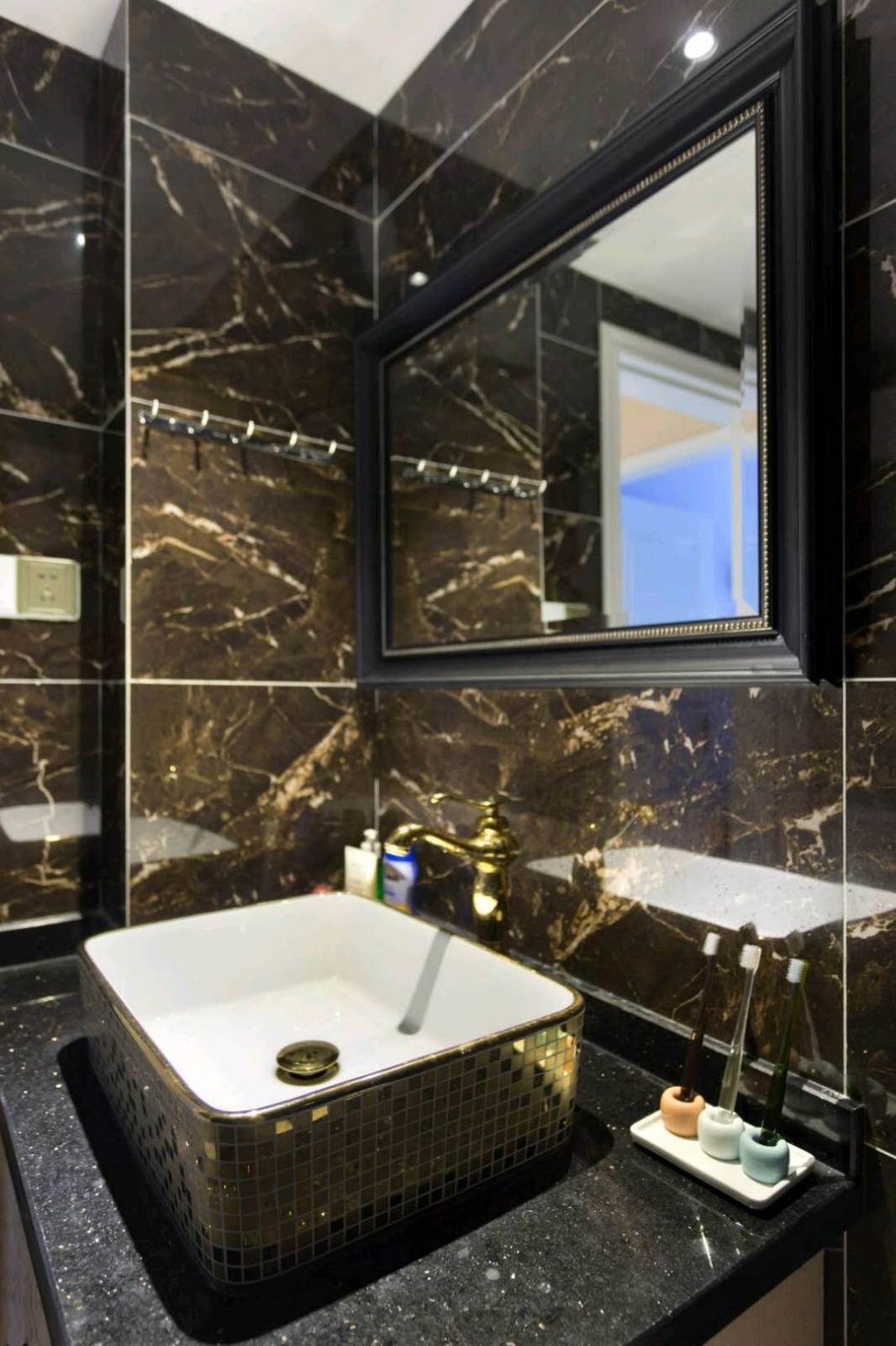 衛(wèi)生間采用防滑磚,干濕分離。深色大理石紋理的磚,讓衛(wèi)生間視覺感十足
