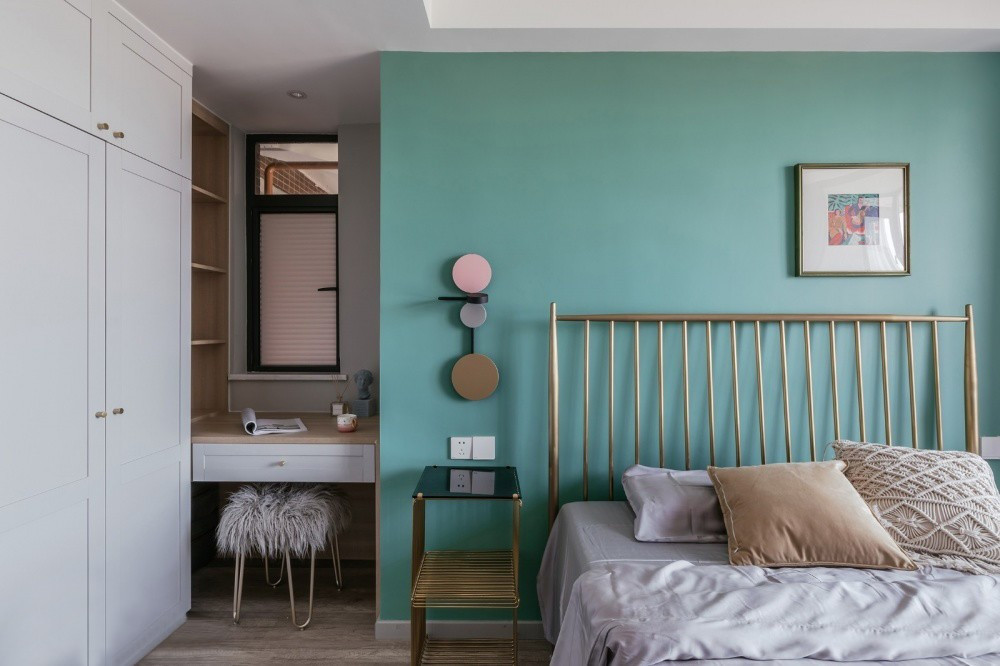 主臥寬敞而明亮,除了一整面墻的衣柜設(shè)計(jì),還專門為女屋主打造了一個(gè)梳妝臺(tái)。