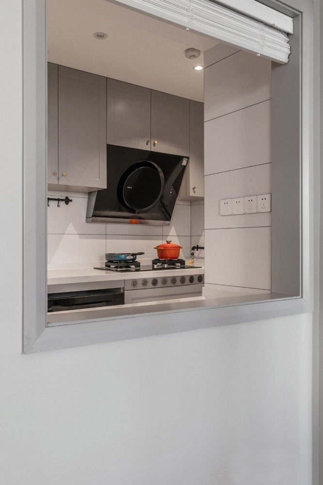 廚房墻面鋪設(shè)白色瓷磚,灰色櫥柜金色拉手,配上地面的小花磚,既精致耐看又方便打理。