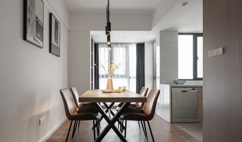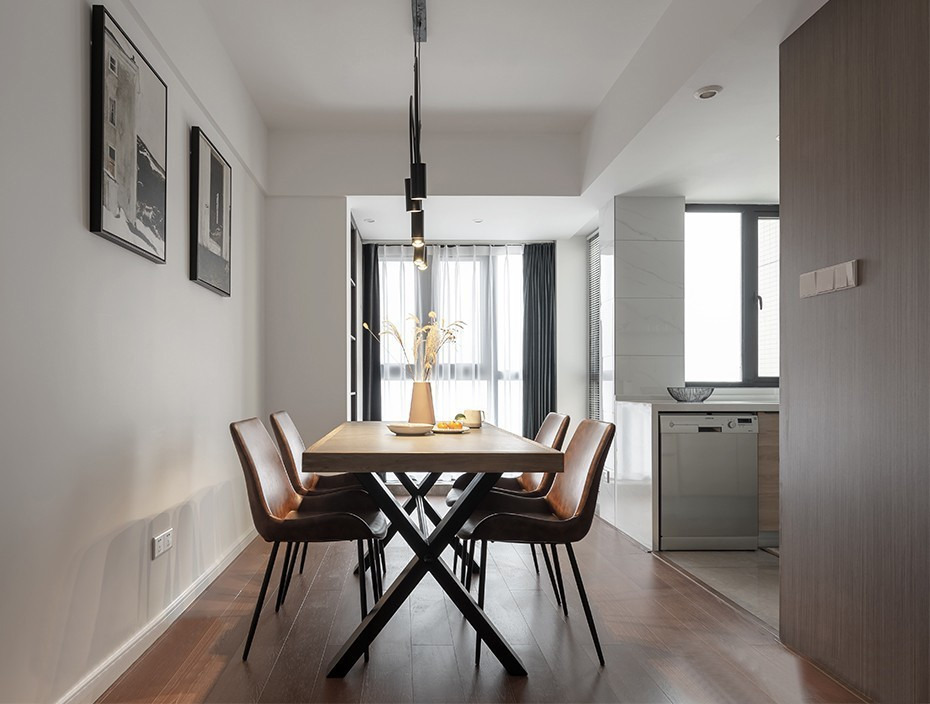 餐廳與廚房相連,通過地面鋪貼不同的材質(zhì)來進行分割,讓空間看似統(tǒng)一卻又獨立。
