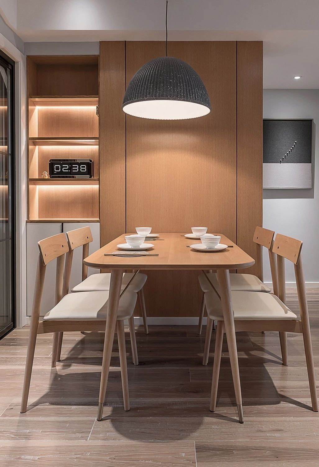 入墻設(shè)計(jì)的餐邊柜收納與展示功能兼?zhèn)洌故靖裰羞€做了藏光設(shè)計(jì),營(yíng)造溫馨舒適的用餐氛圍。