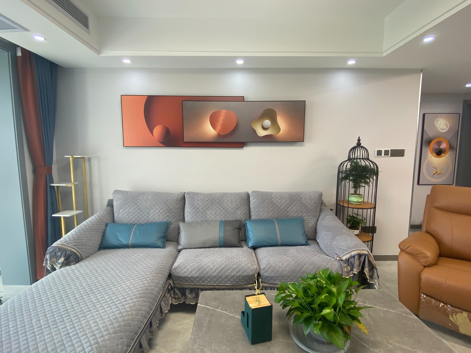 客廳整體簡約大氣,白色的沙發(fā)背景,因為藝術(shù)畫的存在更具神秘藝術(shù)元素,搭配布藝沙發(fā),整體通透