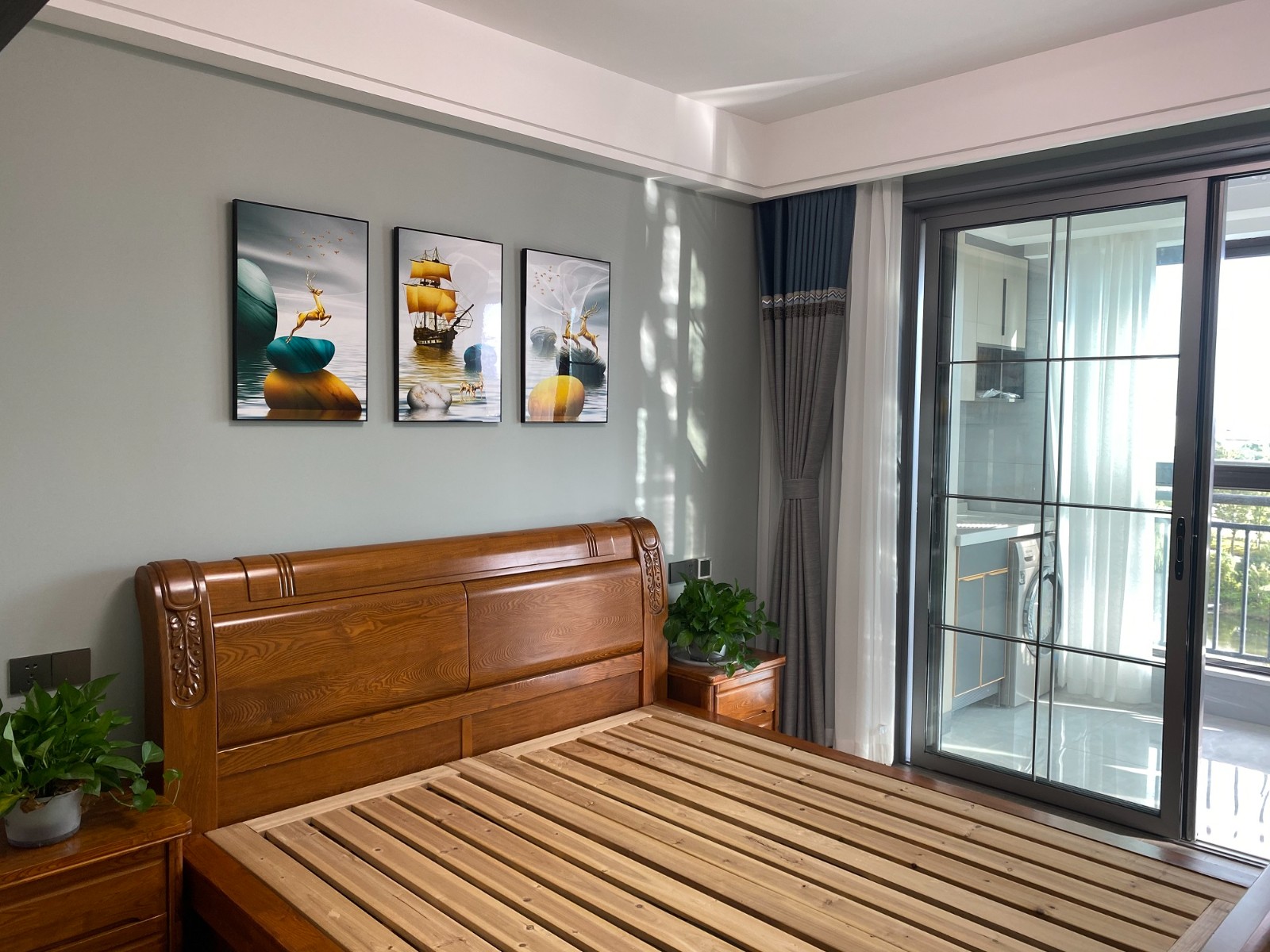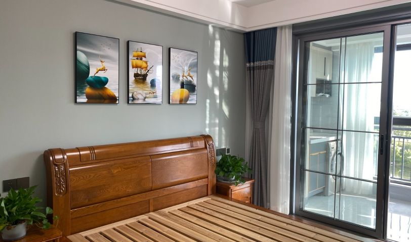 淺綠色的床頭背景,幾幅優(yōu)雅的藝術(shù)畫,讓整個睡眠空間化繁為簡