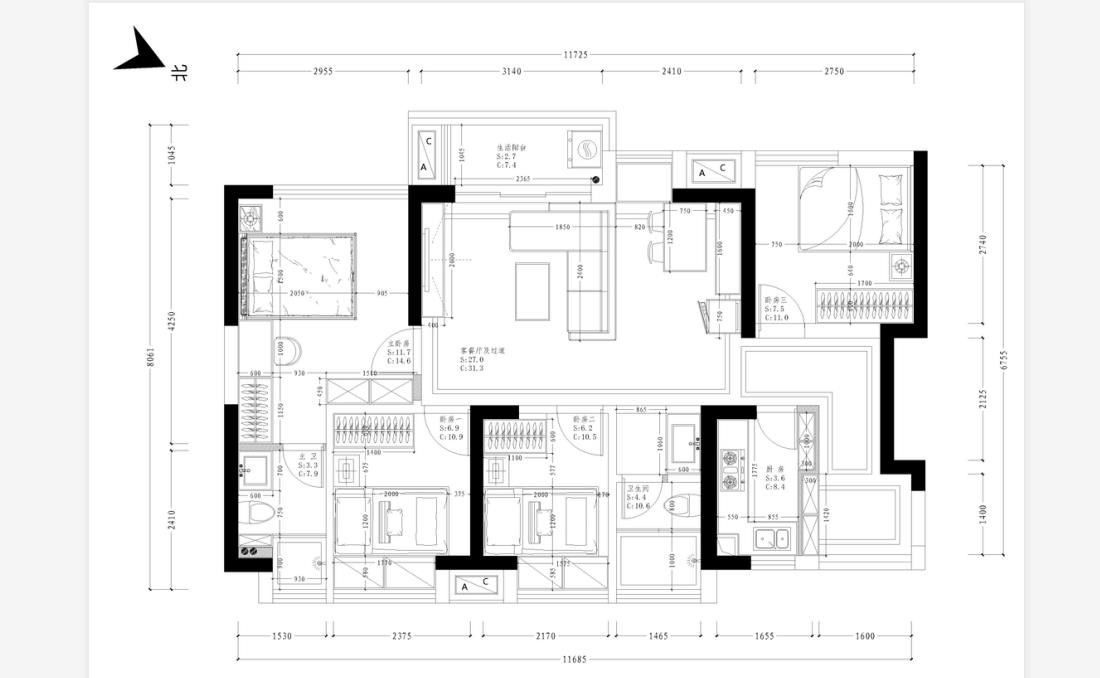 將原結(jié)構(gòu)中的電視墻轉(zhuǎn)了90度,并把走廊融進(jìn)客廳區(qū)域里