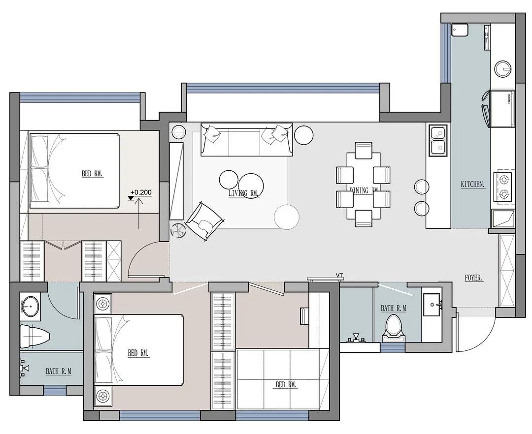 主沙發(fā)則置于靠窗位,更好的享受陽光的同時,相比橫放于客餐廳之間,空間更為開闊。