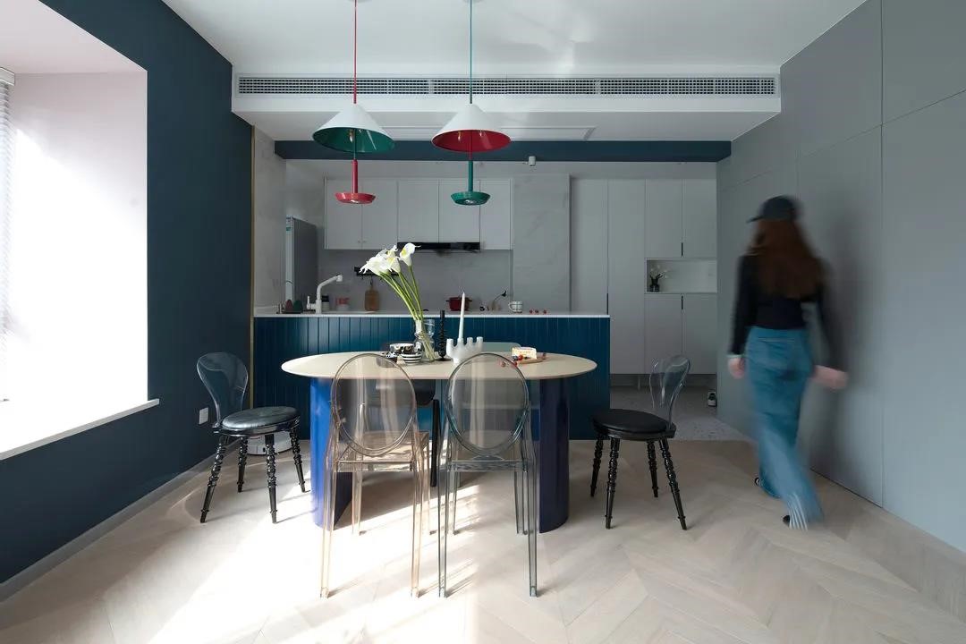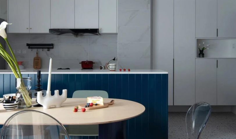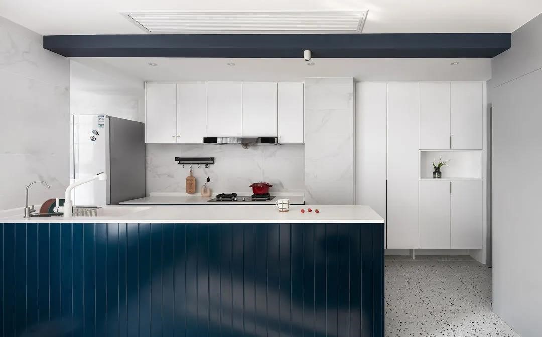 原始廚房與餐廳之間有一根40cm的梁,為了盡量保證層高,廚房區(qū)域吊頂均采用30cm高度,一是為了包平廚房與入戶之間的梁,二是為了風(fēng)管機位置的安放。裸露出來的梁刷深藍色,反而跟櫥柜之間有了呼應(yīng),增添了空間的趣味構(gòu)成感