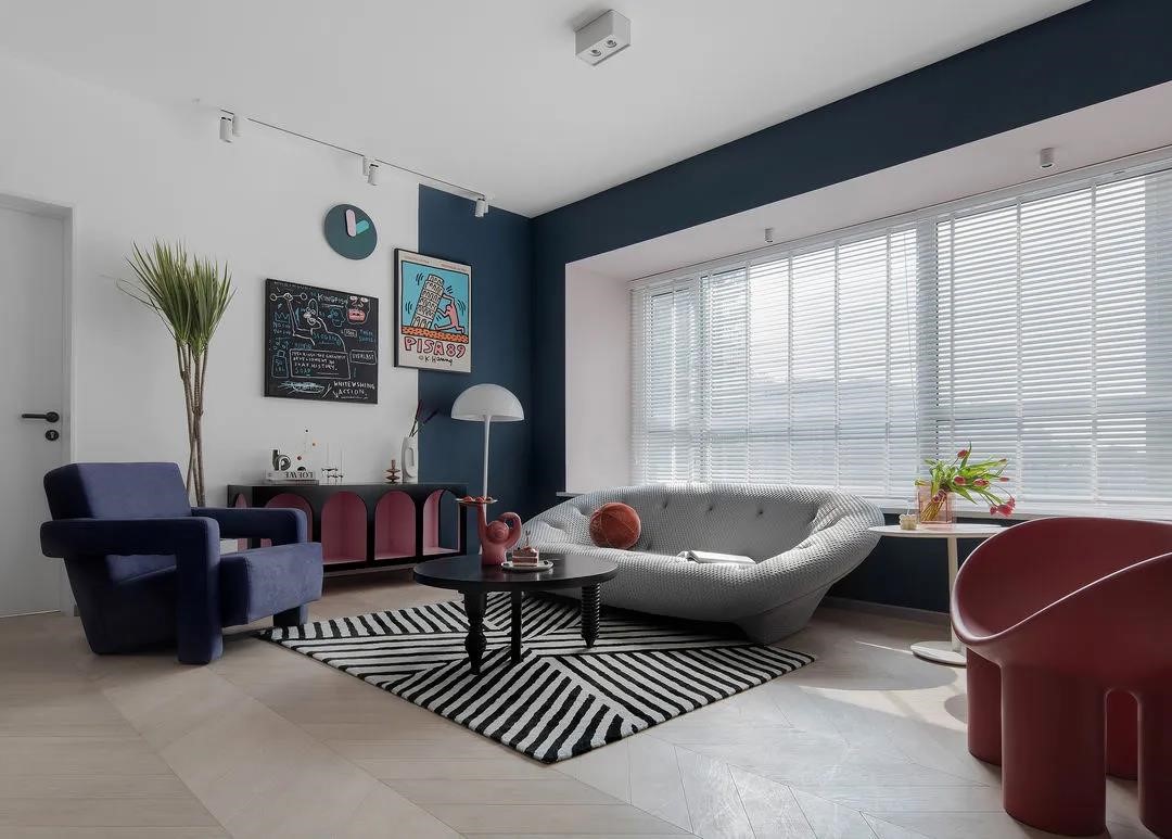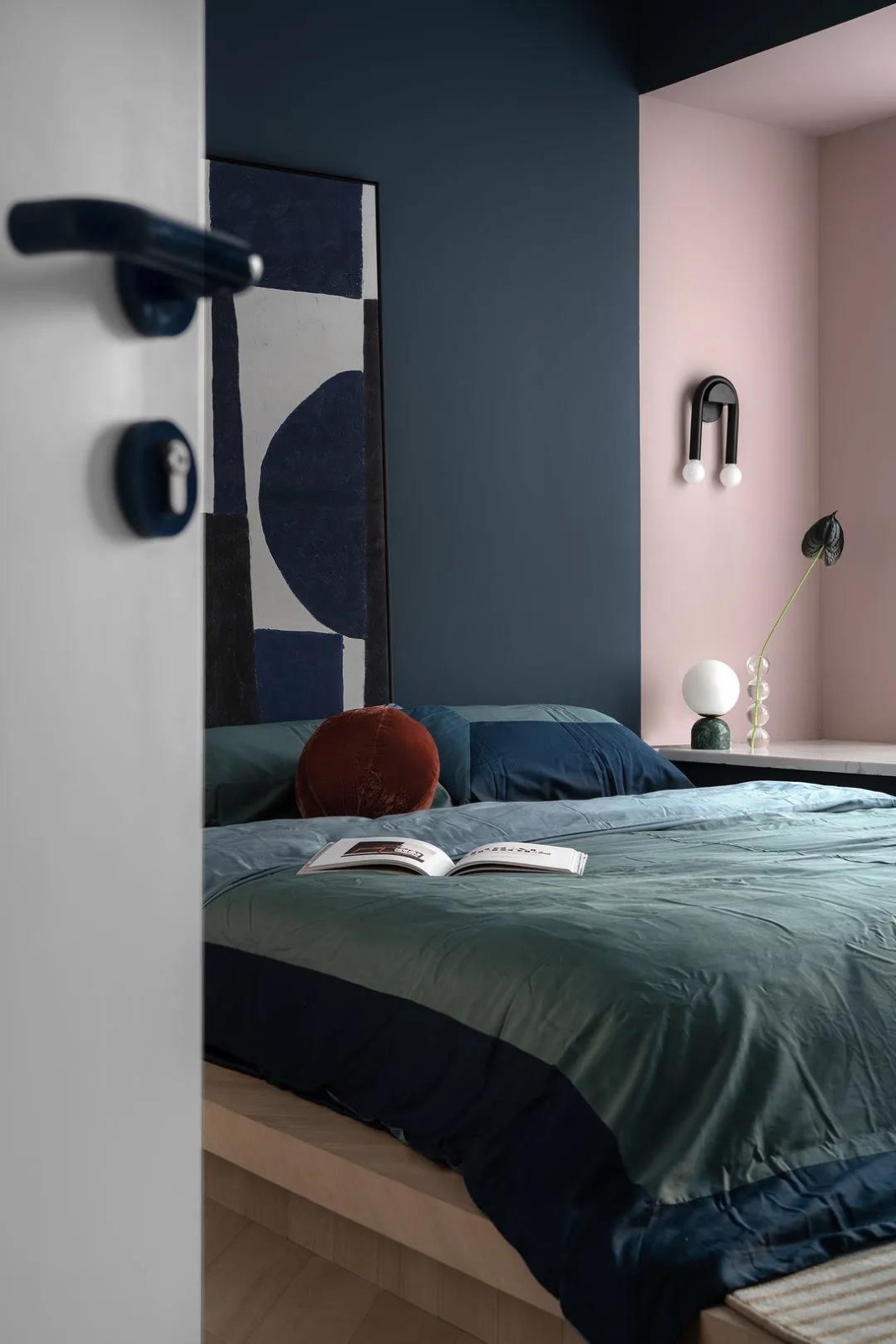 主臥門選擇了極窄2公分門套線,在白色的墻面上比較弱化,盡量減少門對于客廳裝飾墻面整體性的影響,再點綴了比較跳脫的藍色門把手,與墻面色彩呼應(yīng),實用與顏值并存。同時藍色門鎖有起到空間承上啟下的作用,從客廳的藍色系連接到主臥的深藍背景墻。