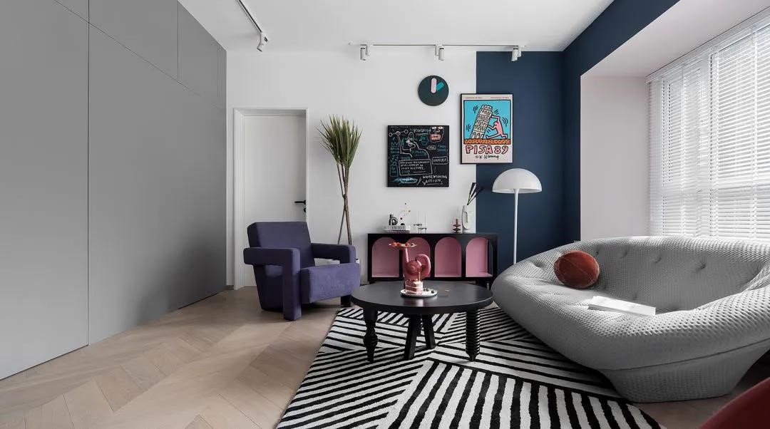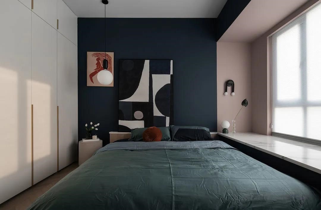 在色彩搭配上,選用讓人比較沉靜、有助于睡眠的深藍,作為臥室的主基調(diào),再配以安寧溫暖的橡皮粉作為輔色,同時白色柜體減少了空間的擁堵感,讓空間色調(diào)也更為的明快。