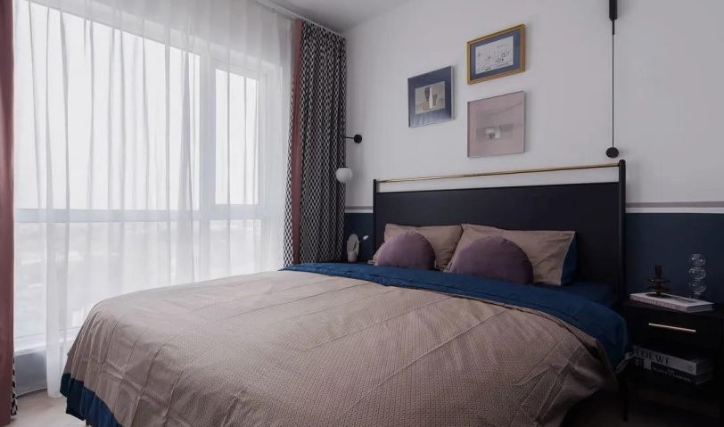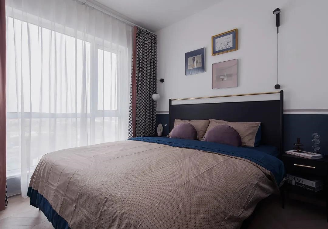 墻面同樣延續(xù)了藍白主基調(diào),藍色半墻點綴粉灰邊帶,讓空間層高視覺上得到拉伸。窗簾搭配上,選擇了深藍與白相間的幾何紋,同時岔了臟粉的邊帶,與空間呼應(yīng),不僅如此,在床品選擇以及掛畫搭配上,都豐富空間層次的同時,又做到和諧統(tǒng)一