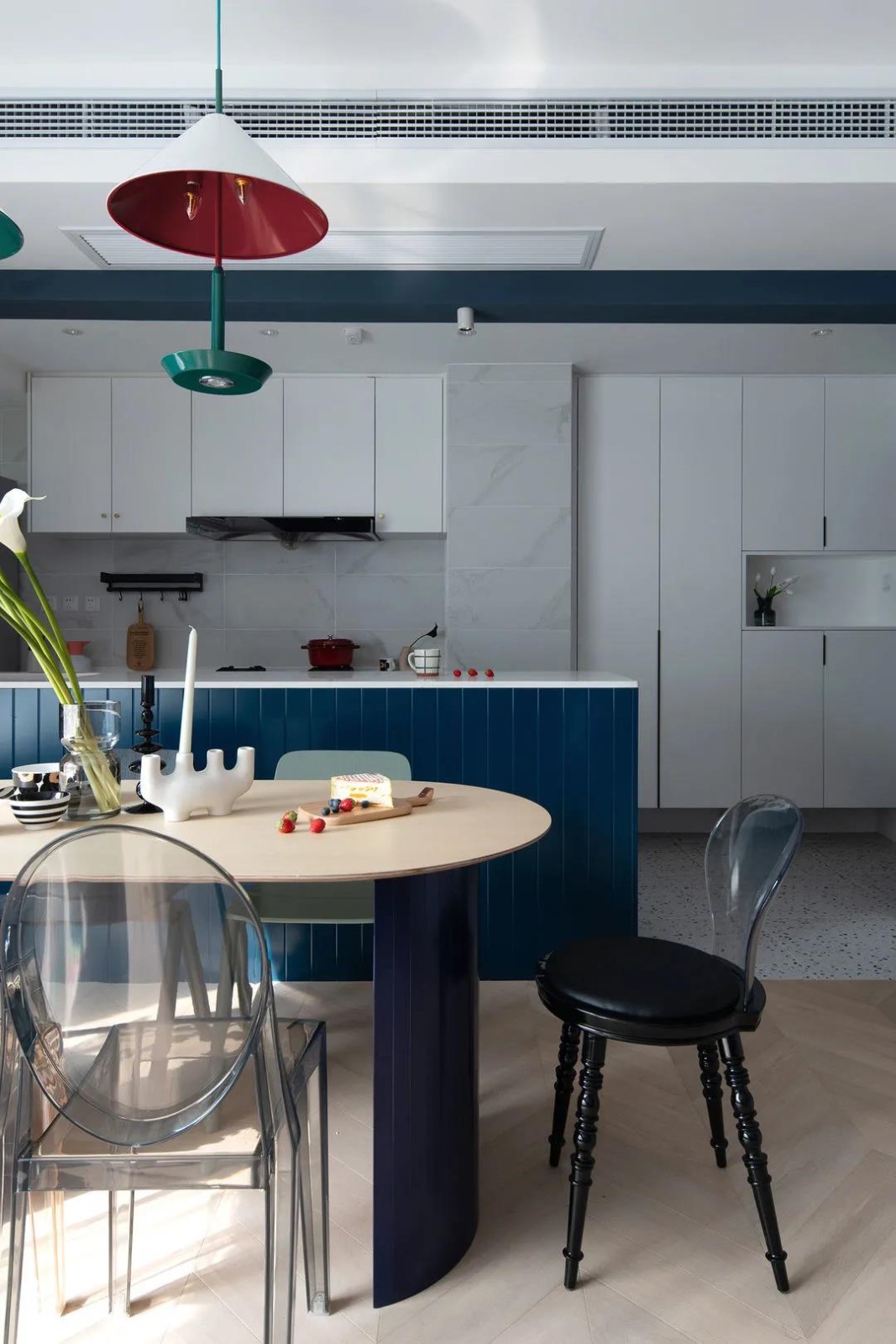 餐椅選透明亞克力材質(zhì)的,讓空間更為輕盈與通透。混搭的餐椅在形狀上與餐桌亦作了呼應(yīng),豐富且統(tǒng)一。