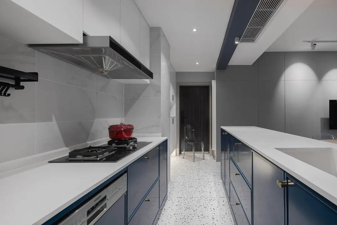 將廚房打開,與入戶客餐廳連為一體,符合現(xiàn)在年輕人居住需求與審美喜好的LDK布局方式,讓空間獲得放大功能。藍白搭配的廚房配以精致的銅把手,空間時尚而精致。煙機與洗碗機均采用內(nèi)嵌的方式,廚房整體顯得更加統(tǒng)一簡潔。