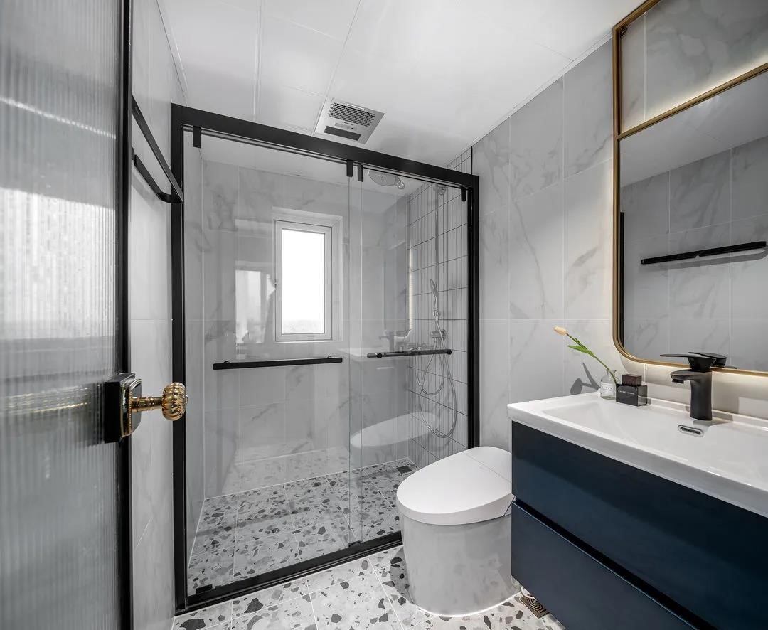 硬裝設(shè)計上選擇了白灰色系,干凈、簡潔,讓緊湊的衛(wèi)生間看起來相對開闊。配以深藍的浴室柜,延續(xù)整個空間的藍色基調(diào),再點綴金色邊框帶燈帶的浴室鏡,讓衛(wèi)浴空間也變得更加精致