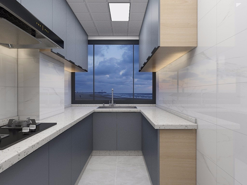 灰藍色的門板讓廚房變得更清爽
