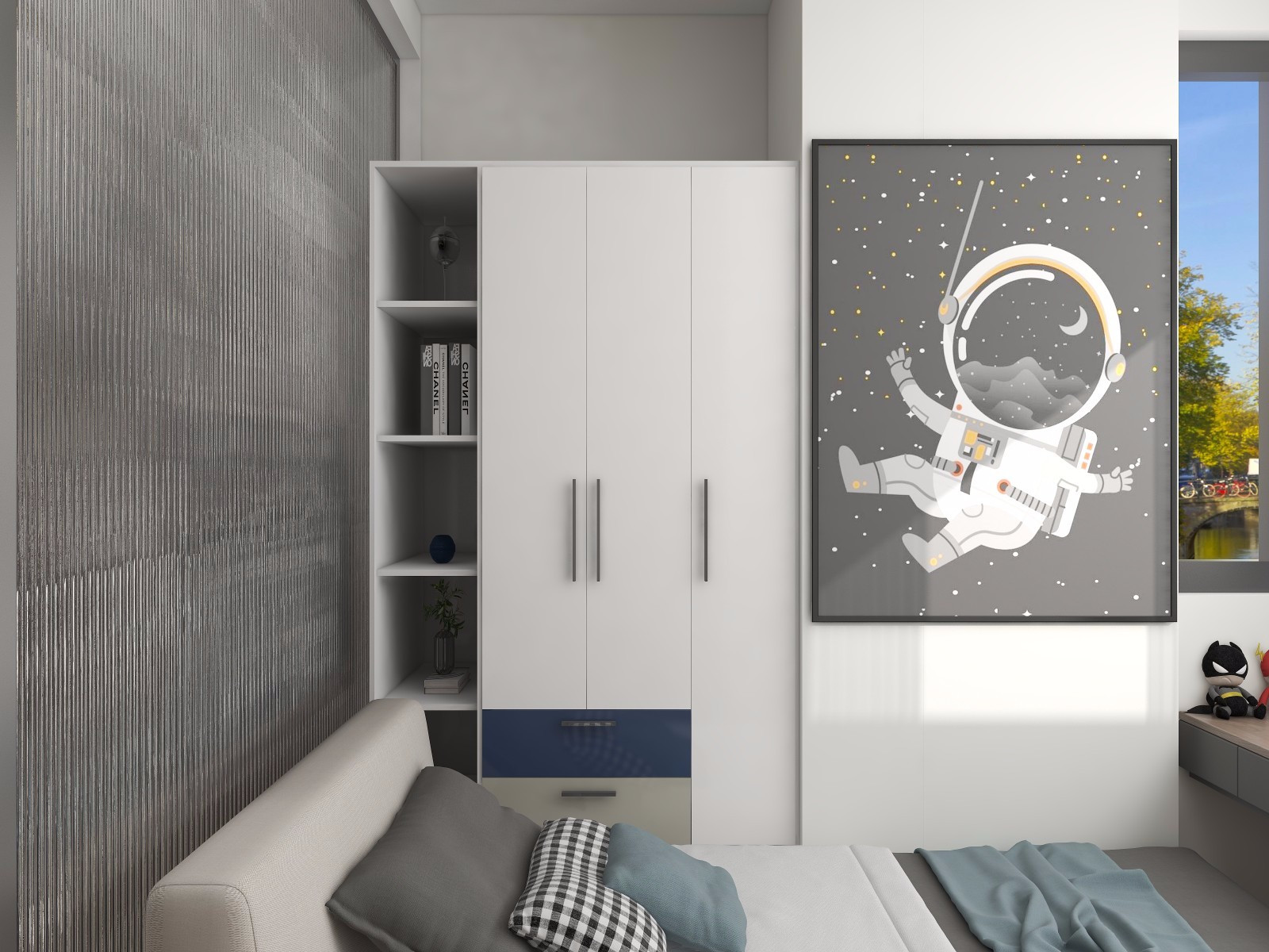 男孩房的轉(zhuǎn)角做內(nèi)嵌臺(tái)上衣柜保證收納同時(shí)可當(dāng)床頭柜